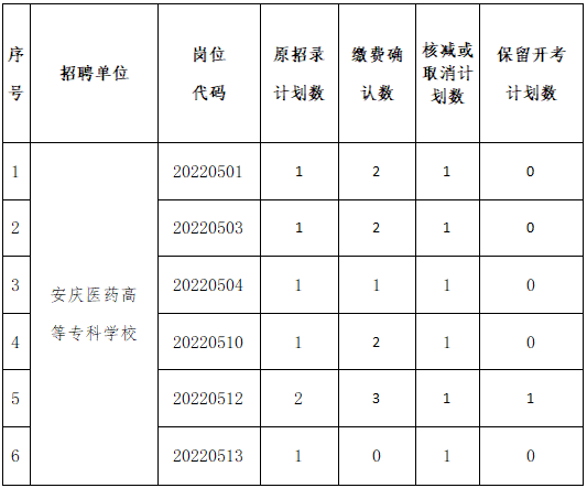 根據《2022年安慶市屬部分高校招聘公告》,經對公開招聘工作人員報名、資格審查及繳費確認,因報考人數未達到開考比例,崗位核減、取消情況公告如下: