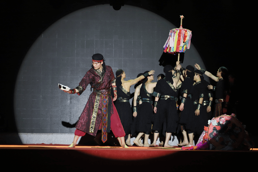 為促進(jìn)學(xué)校間的文化交流,晚會(huì)特邀安慶師范大學(xué)音樂學(xué)院學(xué)生表演原創(chuàng)男子群舞《日月祈》。舞蹈以國家級(jí)非物質(zhì)文化遺產(chǎn)安徽池州儺舞“舞傘”“舞古老錢”為原型,用池州特有的儺面、五色傘、古老錢為道具,將村落里的古老儺文化藝術(shù)化的呈現(xiàn)在舞臺(tái)上,為現(xiàn)場觀眾帶來特別的藝術(shù)體驗(yàn)。