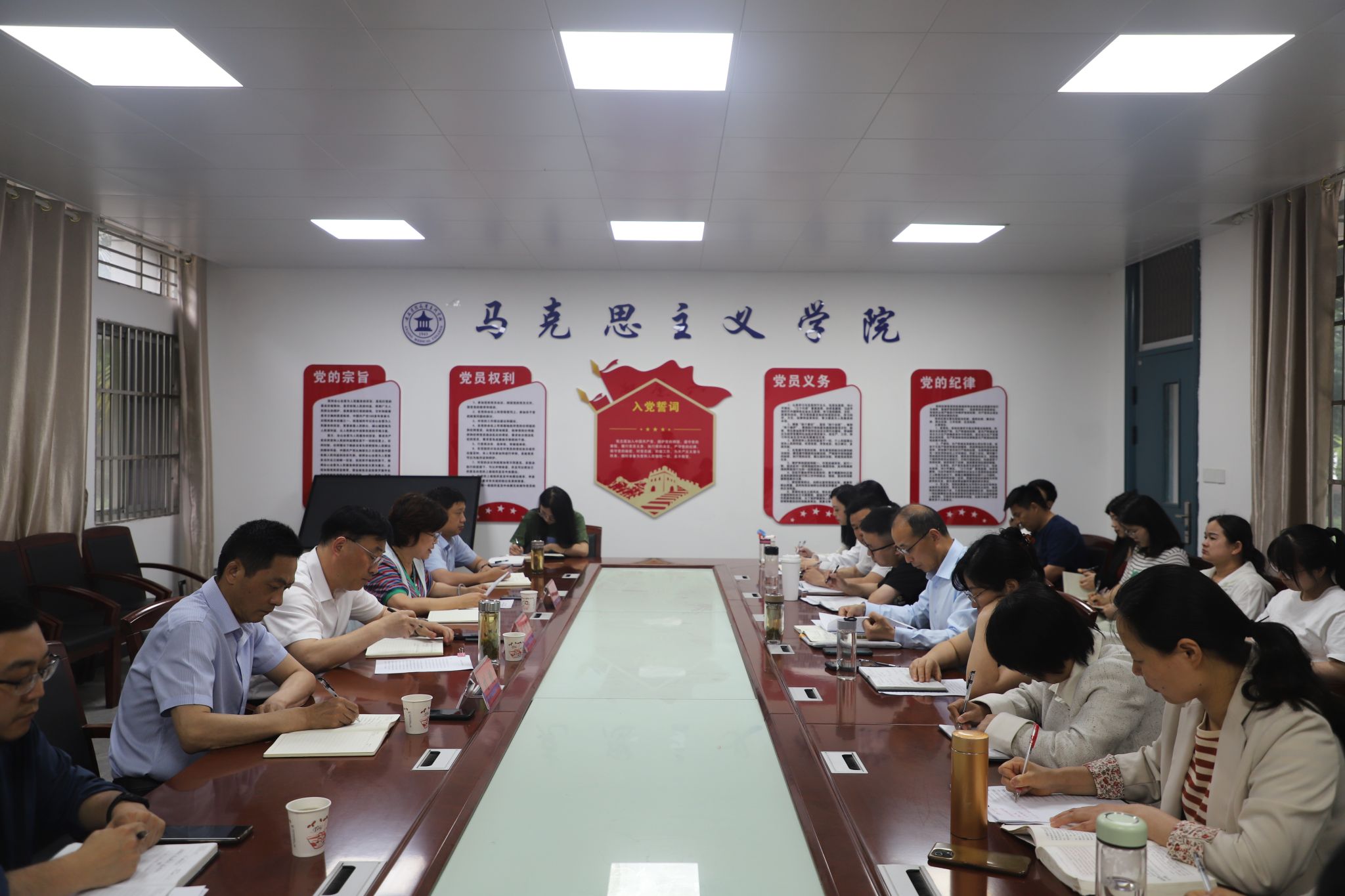 會議集體學習了習近平總書記對學校思政課建設作出的重要指示精神,聽取了馬克思主義學院關于思政課教學工作情況匯報,馬克思主義學院教師代表圍繞“推進學校思政課高質量建設和內涵式發(fā)展”進行交流發(fā)言,研討學校馬克思主義學院建設、思政課建設工作。