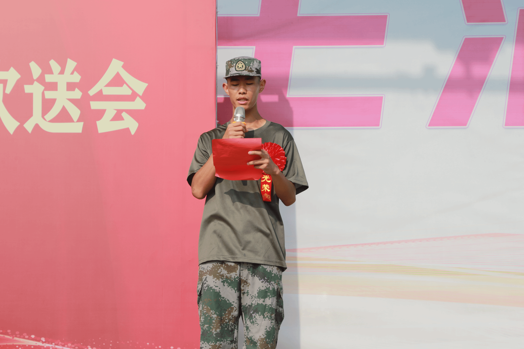 校領導為入伍同學佩戴正紅花、贈送入伍紀念品。