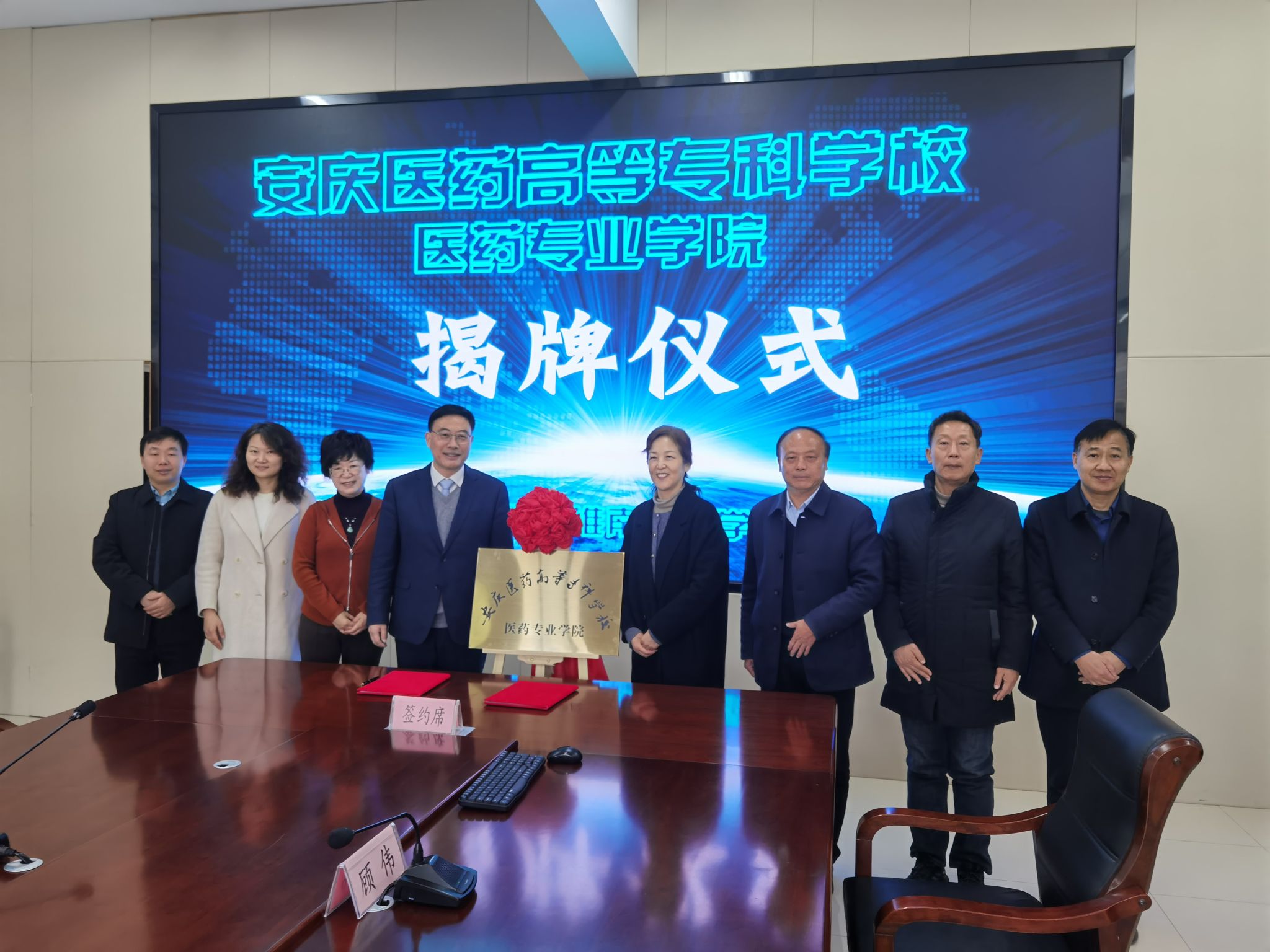 1月7日上午,校黨委副書記、校長朱慶豐,校黨委委員、宣傳部部長朱雯帶領(lǐng)教務(wù)處、發(fā)展規(guī)劃處負(fù)責(zé)人赴安徽省淮南衛(wèi)生學(xué)校舉行安慶醫(yī)藥高等專科學(xué)校醫(yī)藥專業(yè)學(xué)院揭牌儀式。淮南衛(wèi)生學(xué)校黨委書記孫娟,黨委委員、副校長沈安慶、符秀華、欒振知攜招就辦、教務(wù)科、學(xué)生科參加此次揭牌儀式。儀式由安徽省淮南衛(wèi)生學(xué)校黨委委員、副校長沈安慶主持。
