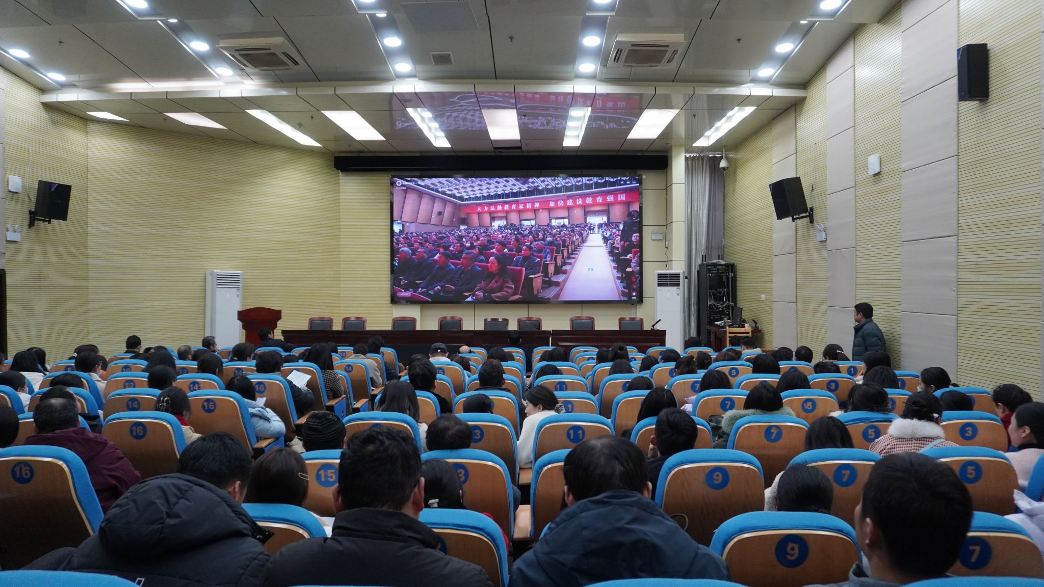 為全面學習貫徹全國全省教育大會精神,落實教育家精神鑄魂強師行動,2月27日下午,我校在圖書館報告廳組織教師集中觀看全國優秀教師代表“教育家精神”2025年巡回宣講活動。此次活動通過線上直播的形式,校領導、各二級單位負責人、行政管理人員、專兼職輔導員、宣講會時無課堂教學任務教師共計200余人收聽收看宣講直播。