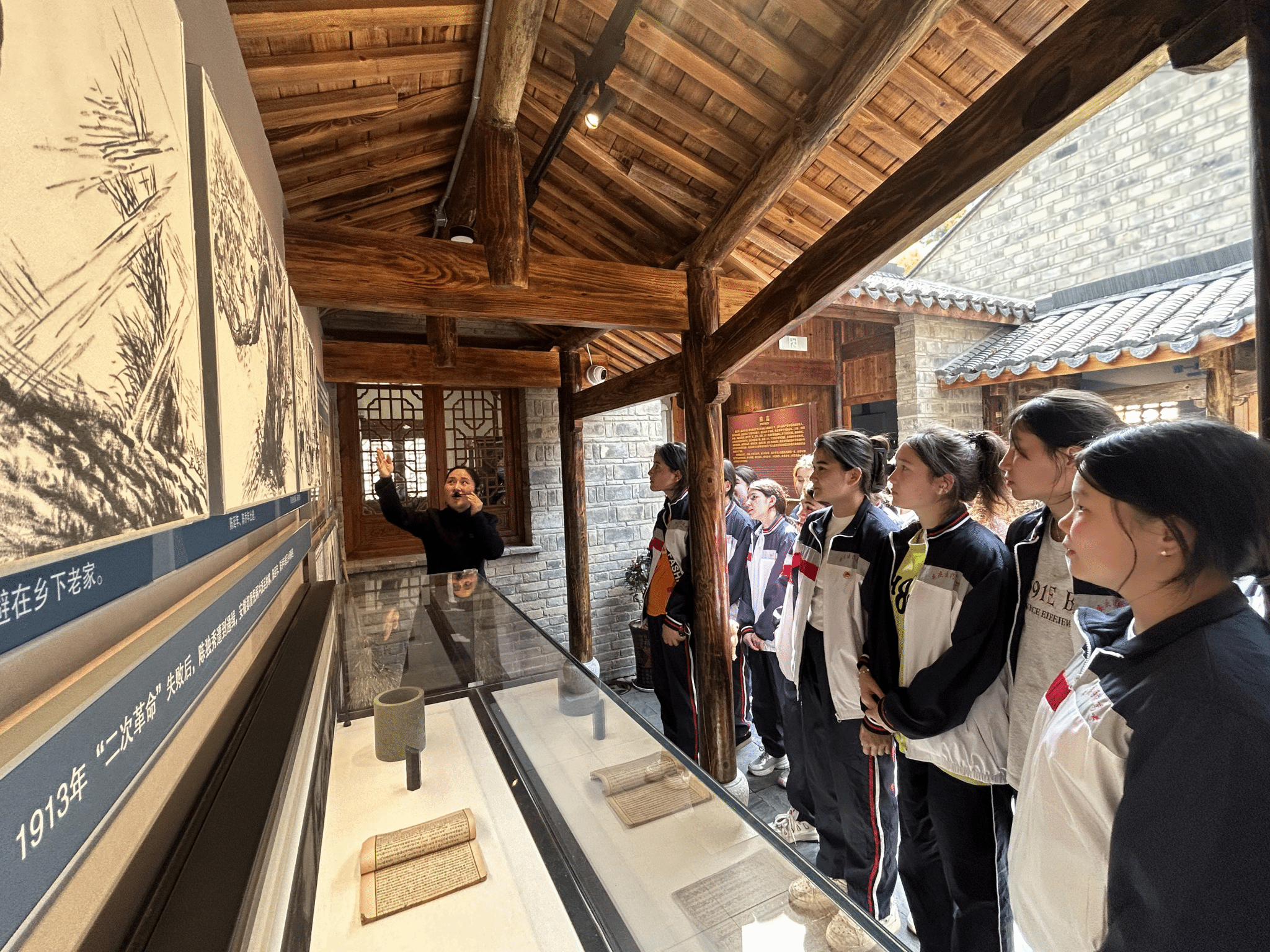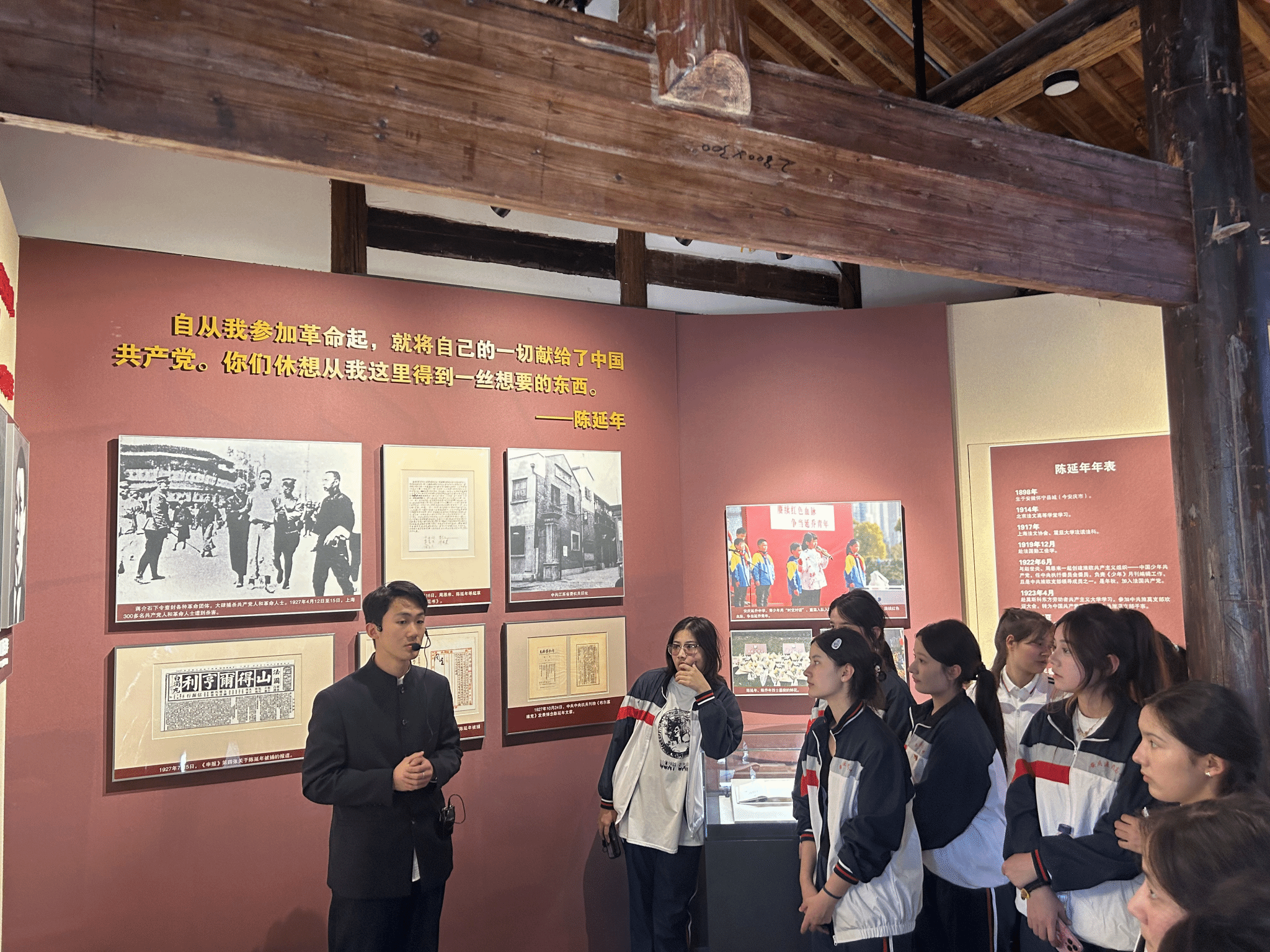 隨后師生們走進展廳,聆聽講解員的生動講述,回顧了兩位烈士從思想啟蒙到投身革命的成長歷程。通過珍貴的歷史圖片、文獻資料和復原場景,學生們了解到陳延年、陳喬年是如何在父親陳獨秀等革命先驅者的影響下,以“青春之我”投身救國事業,最終為革命壯烈犧牲的感人故事。