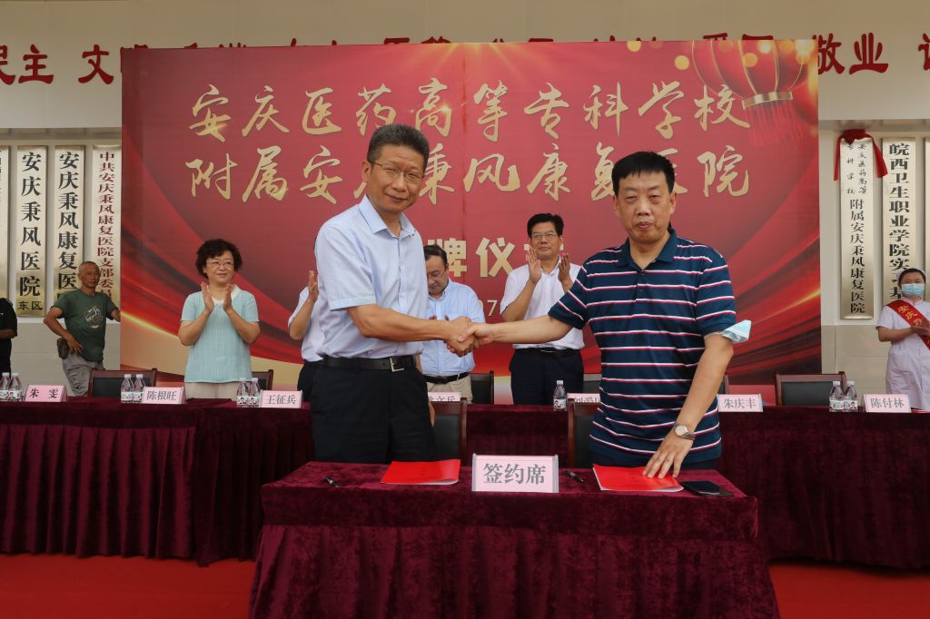 姚文兵和陳付林現場簽署合作協議,并與在場領導嘉賓一起共同為安慶醫藥高等專科學校附屬安慶秉康復醫院揭牌。