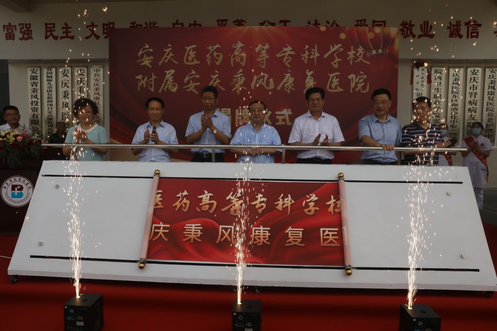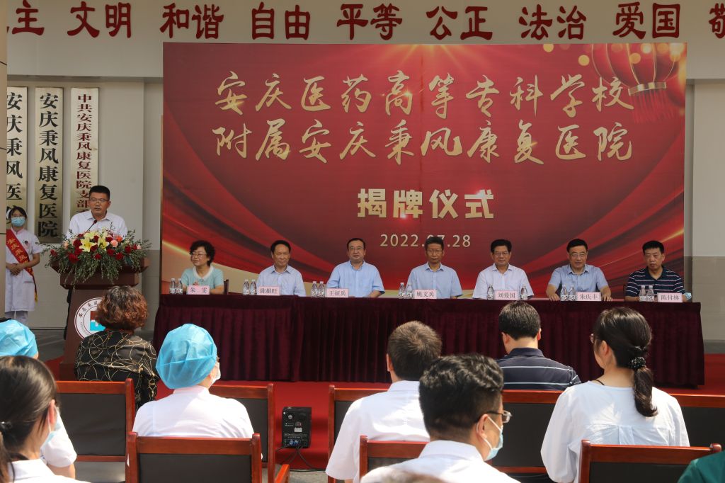 校院合作謀發展,攜手共建譜新篇!為深化醫教研協同創新,加強校院深度合作,7月28日上午,安慶秉風康復醫院成為我校非直屬附屬醫院揭牌簽約儀式隆重舉行。安慶市衛健委黨組成員王征兵,安徽省醫院協會社會辦醫療機構分會會長劉愛國、常務副會長陳根旺出席。校長姚文兵、副校長朱慶豐、校黨委委員朱雯,安慶秉風康復醫院院長陳付林以及學校相關人員和醫院員工代表參加揭牌儀式。