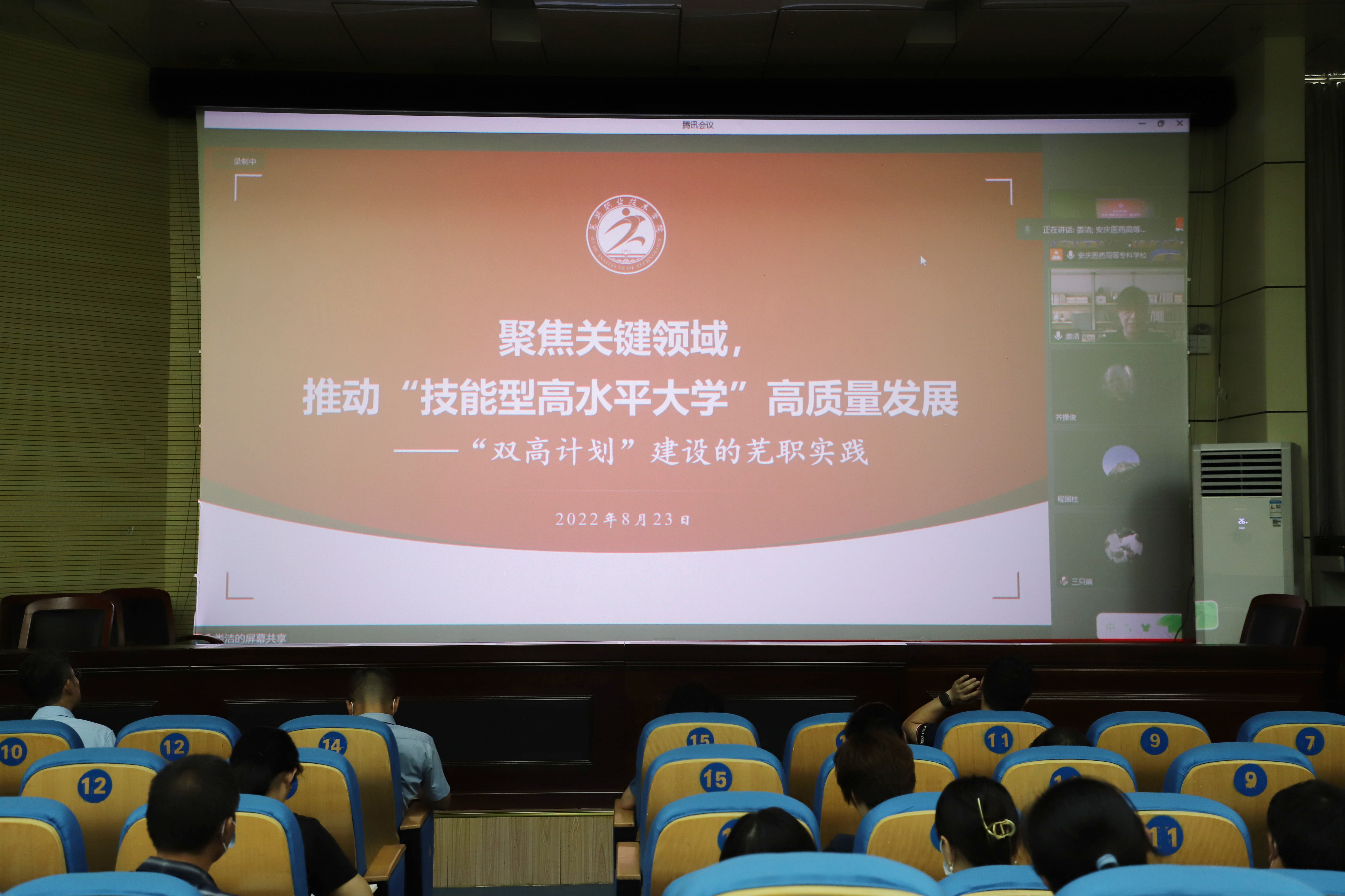 婁潔作題為《聚焦關鍵領域,推動“技能型高水平大學”高質量發展—“雙高計劃”建設的蕪職實踐》專題講座。她介紹了職業教育發展背景和發展新階段,詳細闡述了蕪湖職業技術學院聚焦“一個加強、四個打造、五個提升”關鍵領域,從緊抓重大發展領域、開展本科層次教育、立足區域經濟社會發展和產業轉型升級的人才需求全面推動“高水平大學”高質量發展的實踐模式。
