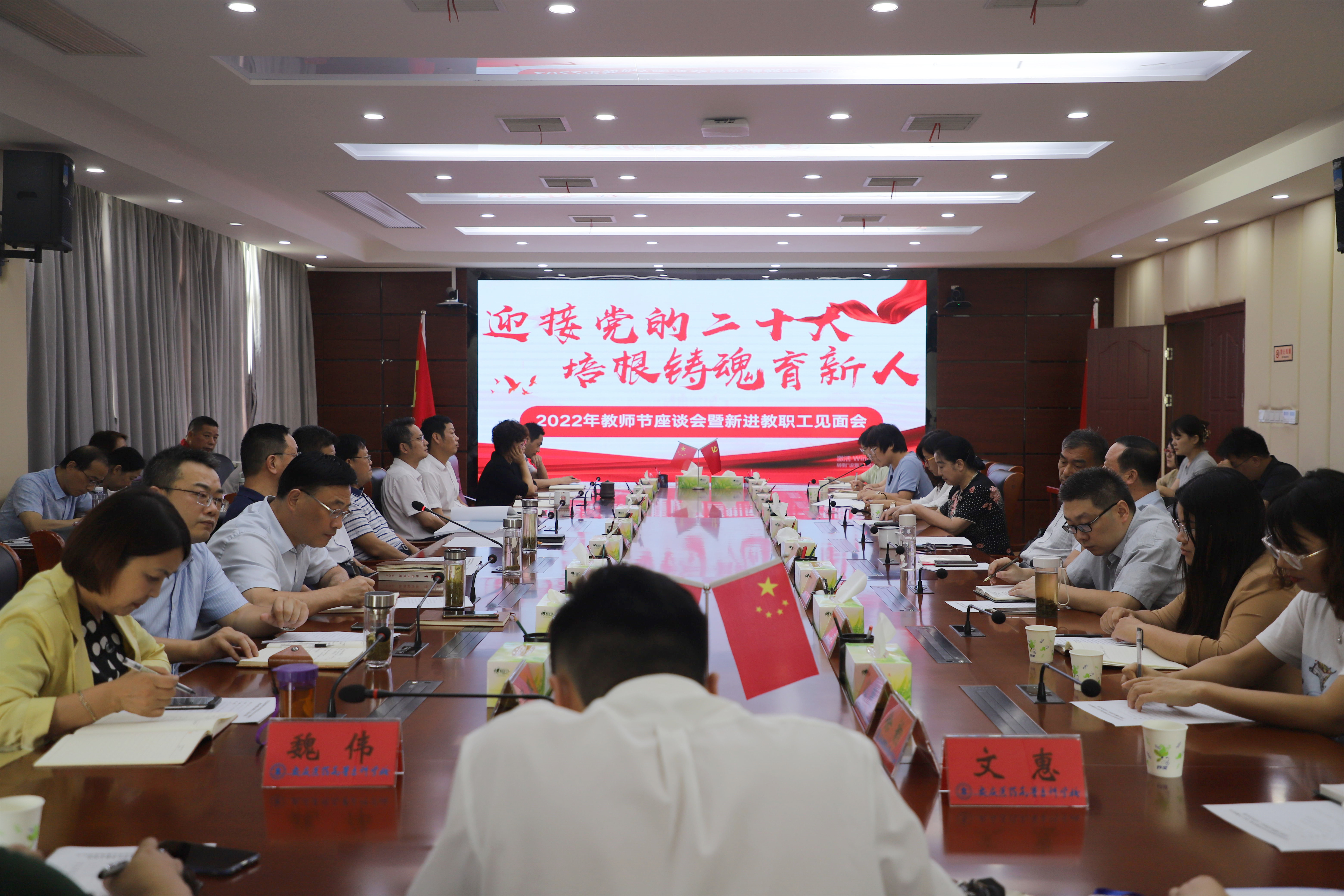 “迎接黨的二十大,培根鑄魂育新人”。9月9日下午,在第三十八個教師節來臨之際,我校召開慶祝2022年教師節座談會暨新進教職工見面會。在校的校領導、校關工委老領導、黨政管理部門及各學院主要負責人、2022年市級相關表彰人員、老教師及學院教職工代表、學生代表、新進教職工等50余人參會。會議由校黨委副書記張仕慶主持。