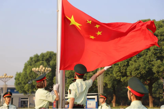 7點30分,國旗護衛隊學生組成的國旗方隊邁著鏗鏘有力的步伐,步入升旗臺。隨著“升國旗、唱國歌”的口令,迎風飄揚的五星紅旗與火紅的旭日交相輝映,雄壯的國歌回蕩耳畔。