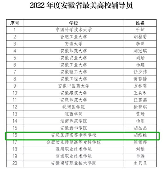 根據(jù)《中共安徽省委教育工委關(guān)于組織開展2022年“最美高校輔導(dǎo)員”推選展示活動(dòng)的通知》(皖教工委函〔2022〕445號(hào))、經(jīng)對(duì)照評(píng)審條件,在學(xué)校申報(bào)、資格審查及線上評(píng)審、專家組評(píng)審、專家組會(huì)評(píng)、評(píng)委會(huì)評(píng)審的基礎(chǔ)上,評(píng)選產(chǎn)生出2022年安徽省“最美高校輔導(dǎo)員”20名,我校胡維維老師榮獲本年度安徽省最美高校輔導(dǎo)員。