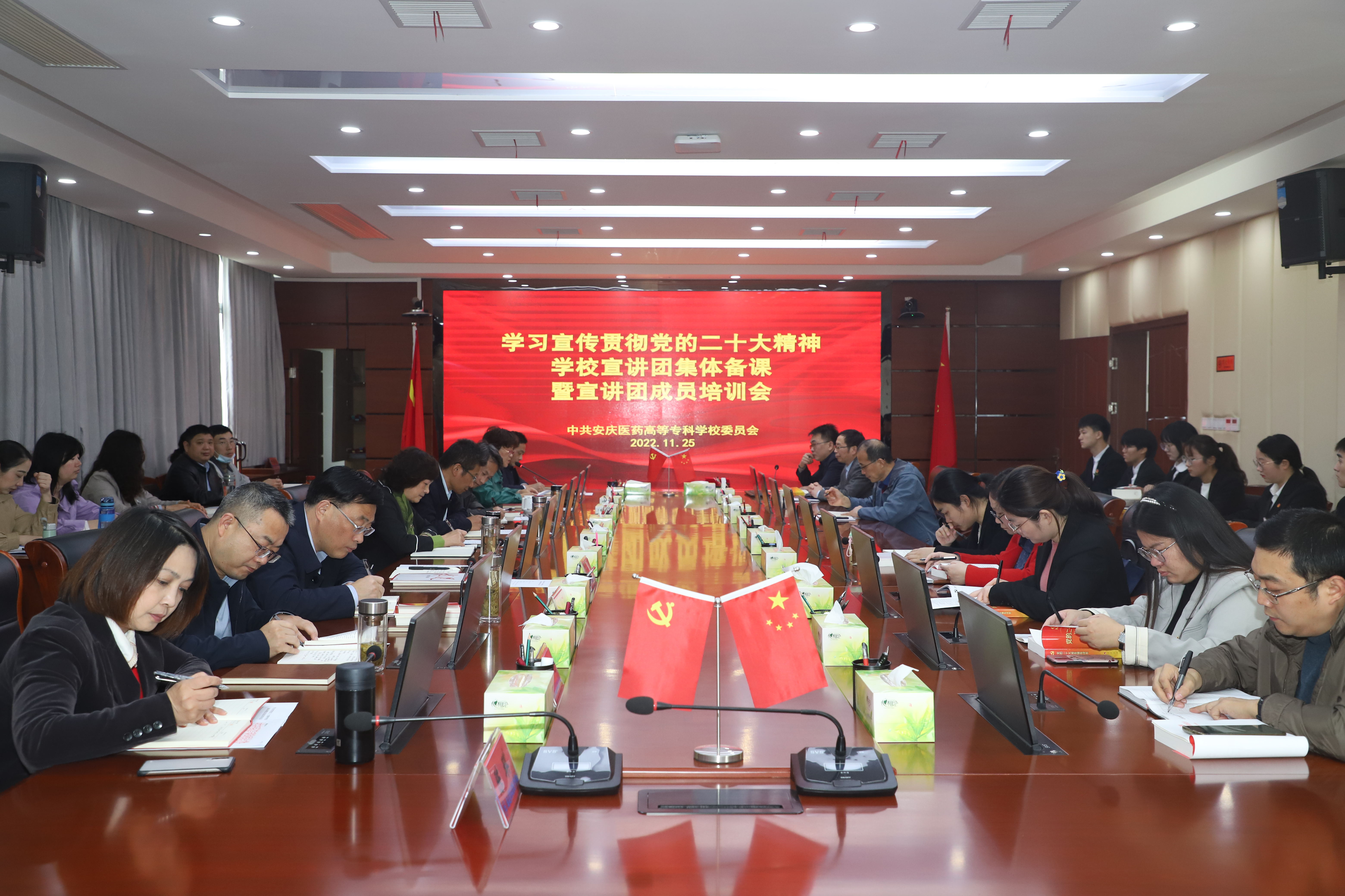 11月25日中午,學校召開學習宣傳貫徹黨的二十大精神宣講團集體備課暨宣講團成員培訓會,校黨委書記葉林霞出席會議并講話,市委講師團團長陳大士受邀作宣講報告。校黨委委員、宣傳部部長朱雯主持會議。