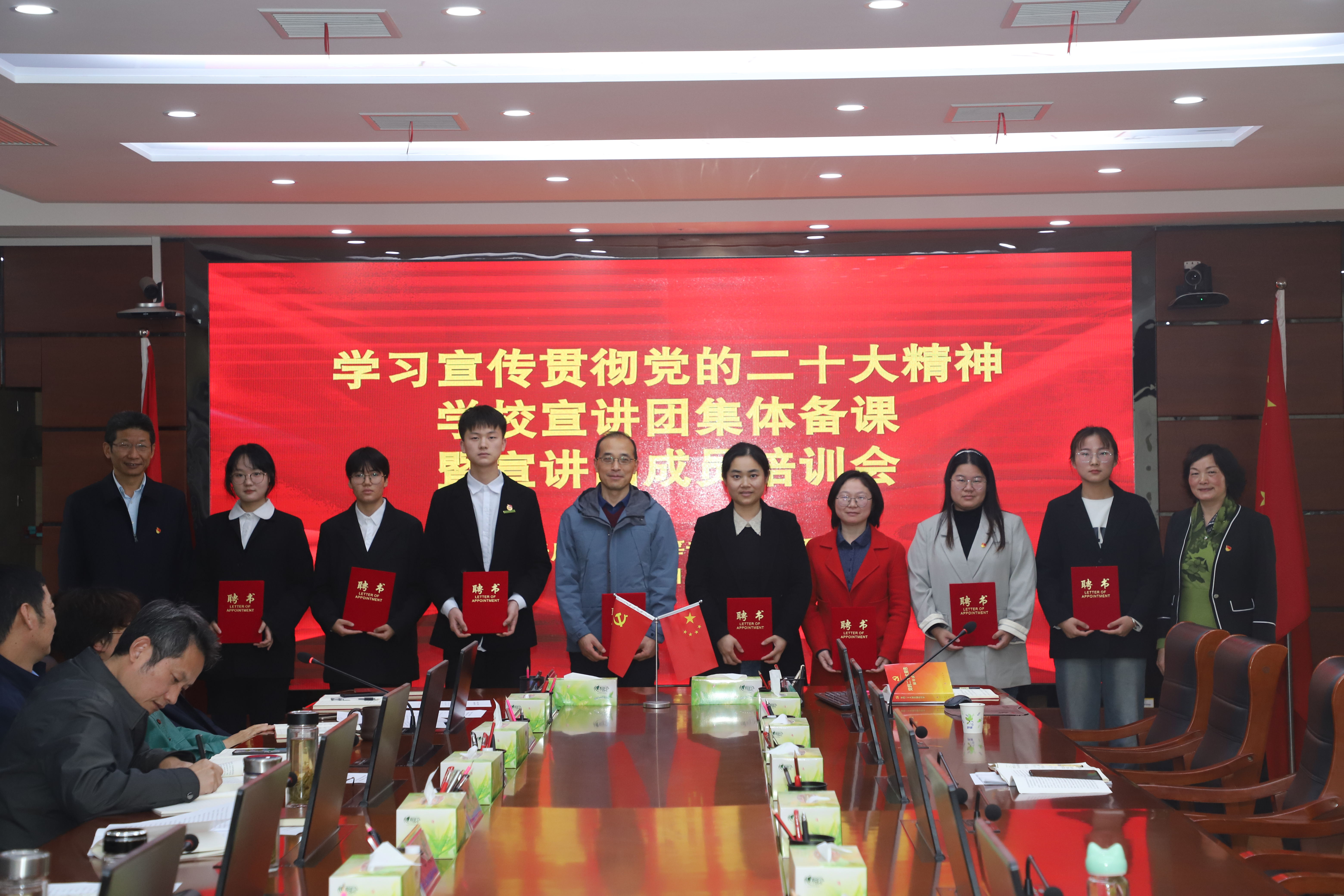 會上,校黨委書記葉林霞、校長姚文兵還為宣講團成員頒發了聘書,送上學習材料。