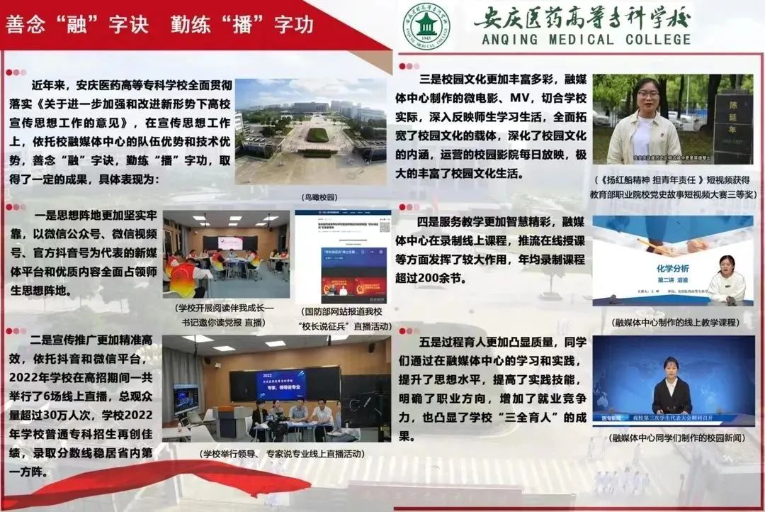 學(xué)校以融媒體中心平臺(tái)建設(shè)為契機(jī),積極構(gòu)建與完善新媒體矩陣,充分發(fā)揮融媒體中心在陣地建設(shè)、宣傳推廣、文化建設(shè)、教育教學(xué)、過程育人等方面的作用,在筑牢思想陣地、宣傳推廣學(xué)校,豐富校園文化內(nèi)涵、服務(wù)教育教學(xué)、提升育人水平等方面不斷取得新成果。下一步,學(xué)校將緊緊圍繞高質(zhì)量發(fā)展和應(yīng)用型醫(yī)學(xué)本科院校建設(shè)目標(biāo),深入開展理論宣傳研究闡釋工作,深入挖掘宣傳思想工作、意識(shí)形態(tài)、文明創(chuàng)建、校園文化建設(shè)等方面的新舉措新進(jìn)展新成效,全面宣傳推廣醫(yī)專先進(jìn)典型和感人故事,奮力推動(dòng)宣傳思想工作再上新臺(tái)階,切實(shí)為學(xué)校改革發(fā)展穩(wěn)定提供有力的思想保證、輿論支持和精神動(dòng)力。(宣傳部)