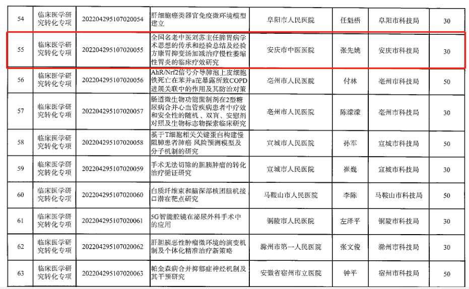 科研路上,喜報頻傳。1月6日,安徽省科學技術廳正式發布《關于下達2022年安徽省臨床醫學研究轉化專項項目名單》,我校附院(安慶市中醫醫院)申報的“全國名老中醫劉蘇主任脾胃病學術思想的傳承和經驗總結及經驗方康胃抑變湯加減治療慢性萎縮性胃炎的臨床療效研究”獲批立項,標志著醫院在省級科創平臺建設上取得新突破。