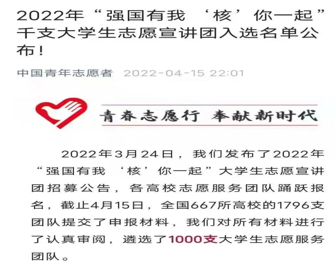 大學生“青鴿志愿宣講隊”成功入選2022年全國“強國有我“核’你一起”千支大學生宣講團