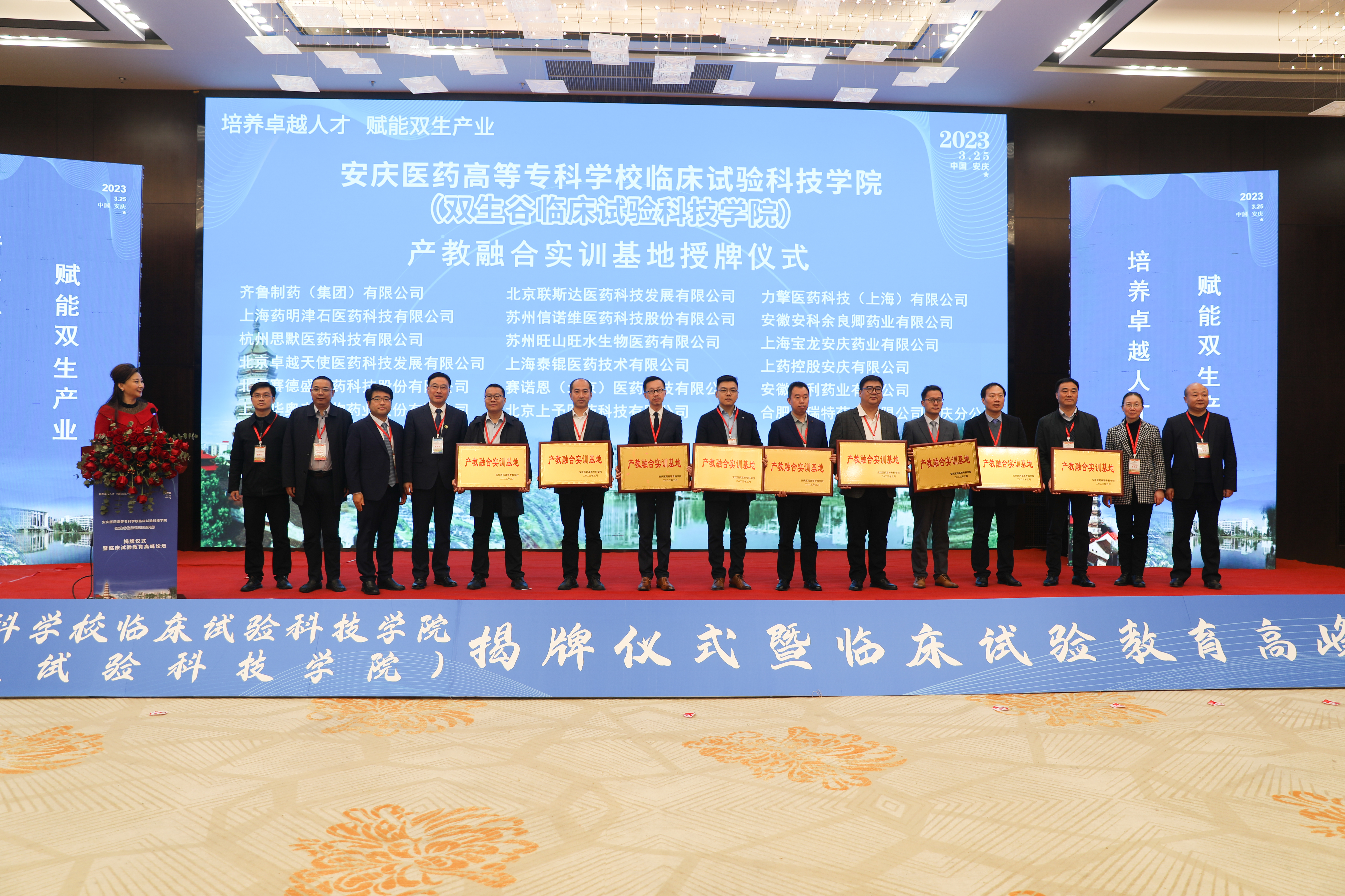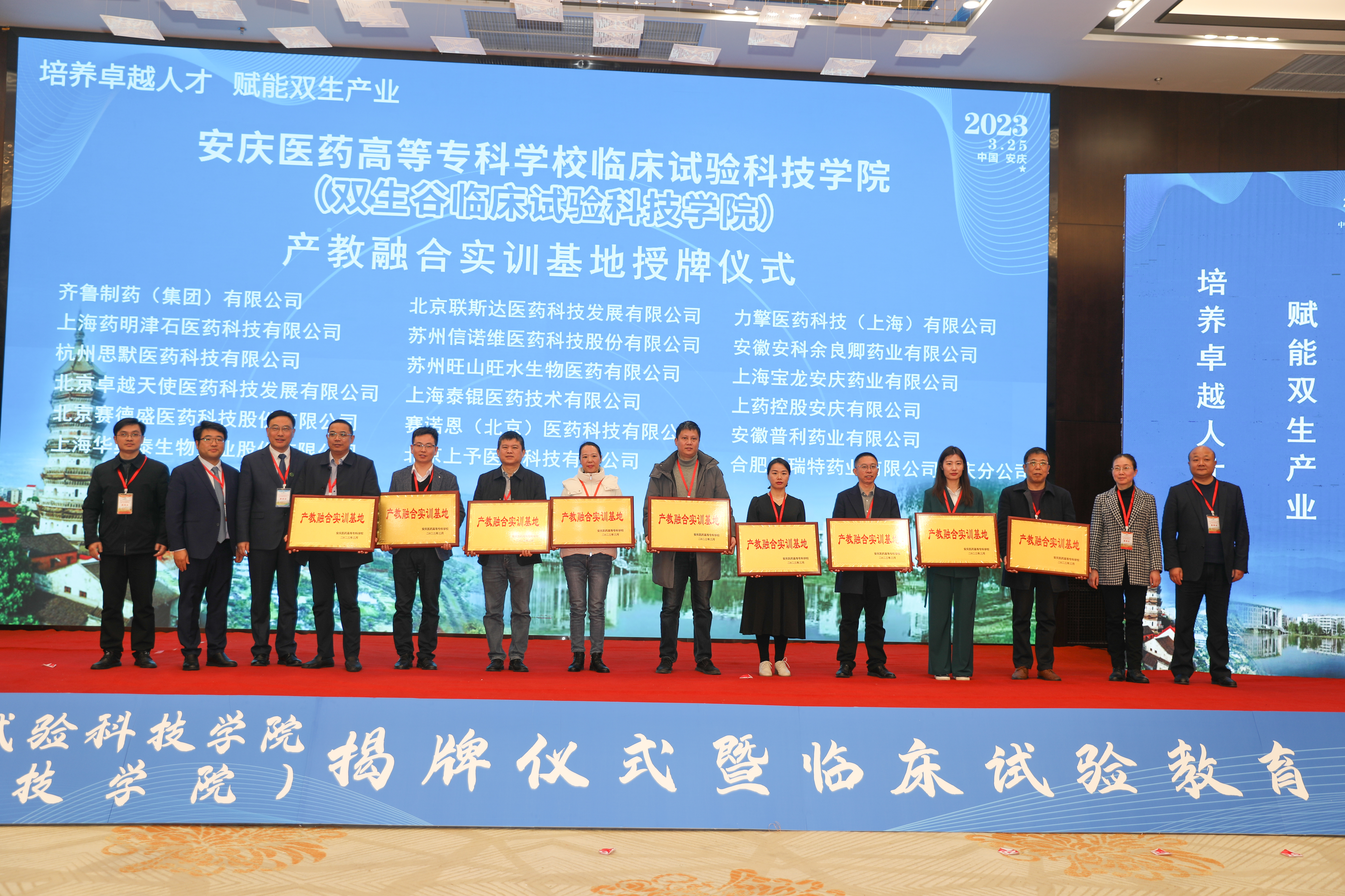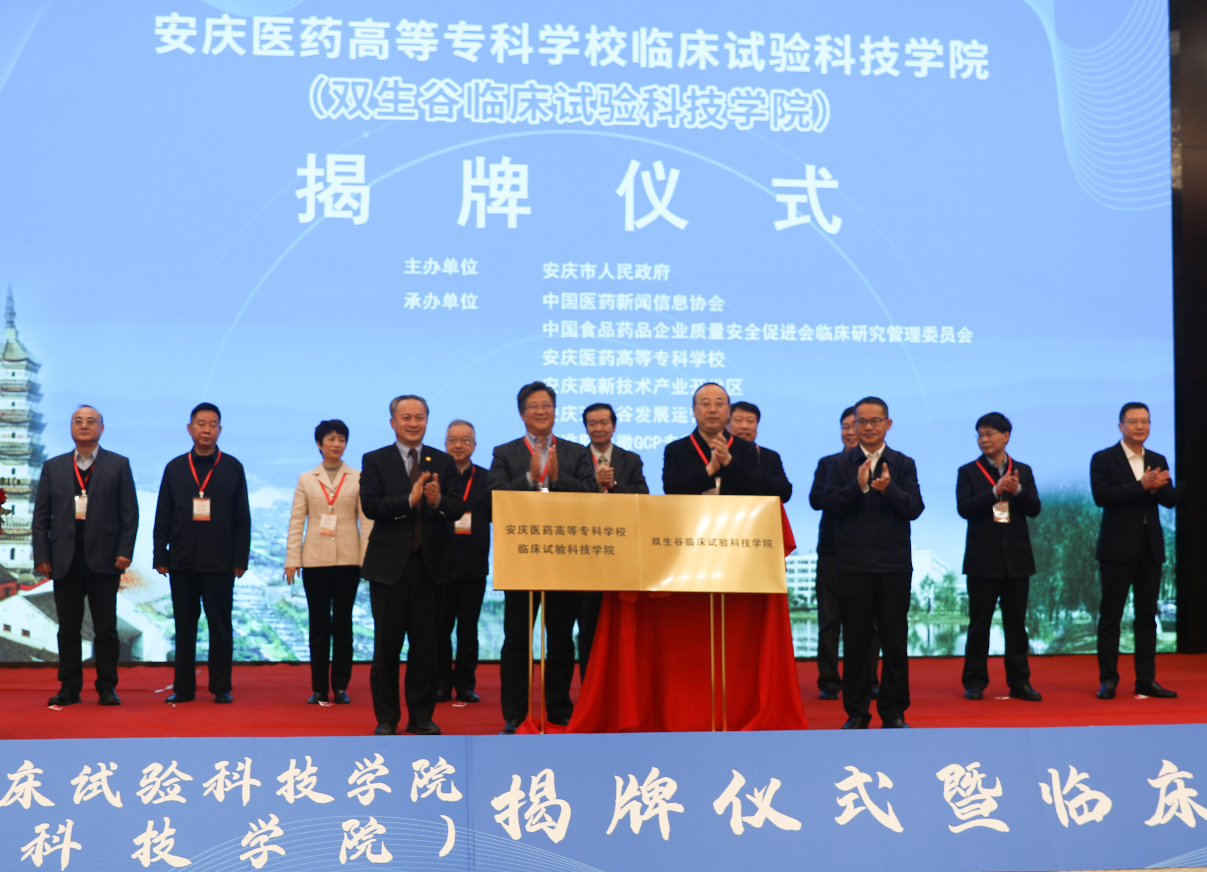 2023年3月25日上午,安慶醫藥高等專科學校臨床試驗科技學院(雙生谷臨床試驗科技學院)在安慶市隆重揭牌。安徽省政協副主席,安慶市委書記張祥安與安徽省委教育工委副書記、廳機關黨委書記王佩剛、安徽省衛健委一級巡視員董明培以及蚌埠醫學院院長、中國科學技術大學臨床醫學院執行院長翁建平共同為安慶醫藥高等專科學校臨床試驗科技學院揭牌。中國科學院院士王福生通過視頻對臨床試驗科技學院的揭牌表示了祝賀。安慶市委副書記、市長張君毅在揭牌儀式上致辭。中國醫藥新聞信息協會副會長兼秘書長葉建華,俄羅斯工程院外籍院士、昆翎醫藥聯合創始人兼首席戰略官張丹、中國藥科大學博士生導師丁黎等行業專家參加揭牌儀式。市委副書記胡紅兵、市委常委、組織部部長、市委常委、統戰部部長、秘書長徐雄、安慶市人大常委會副主任朱菊云、市政府副市長王趙春、市政協副主席尹志軍、市政府秘書長劉文俊出席揭牌儀式。