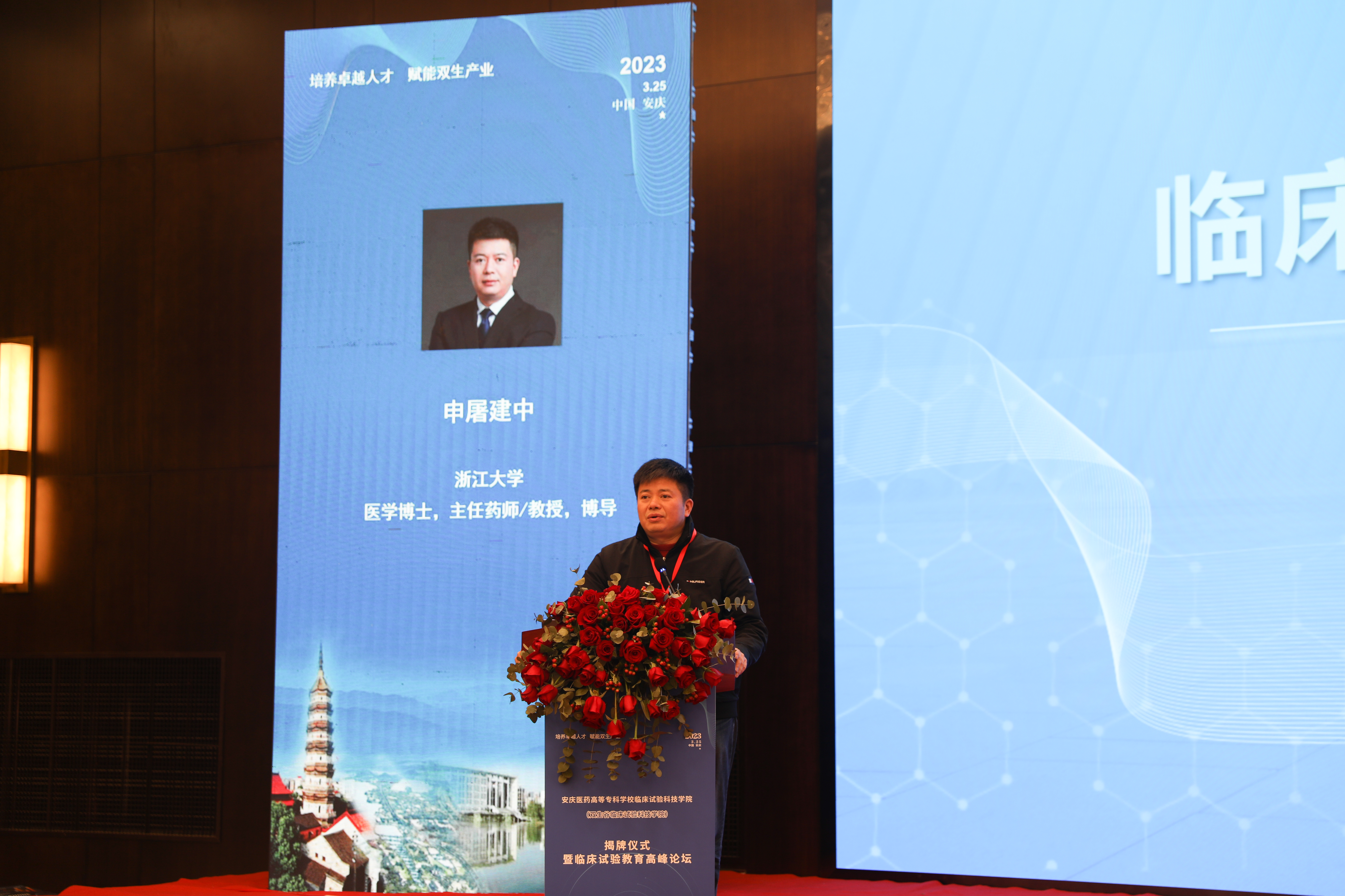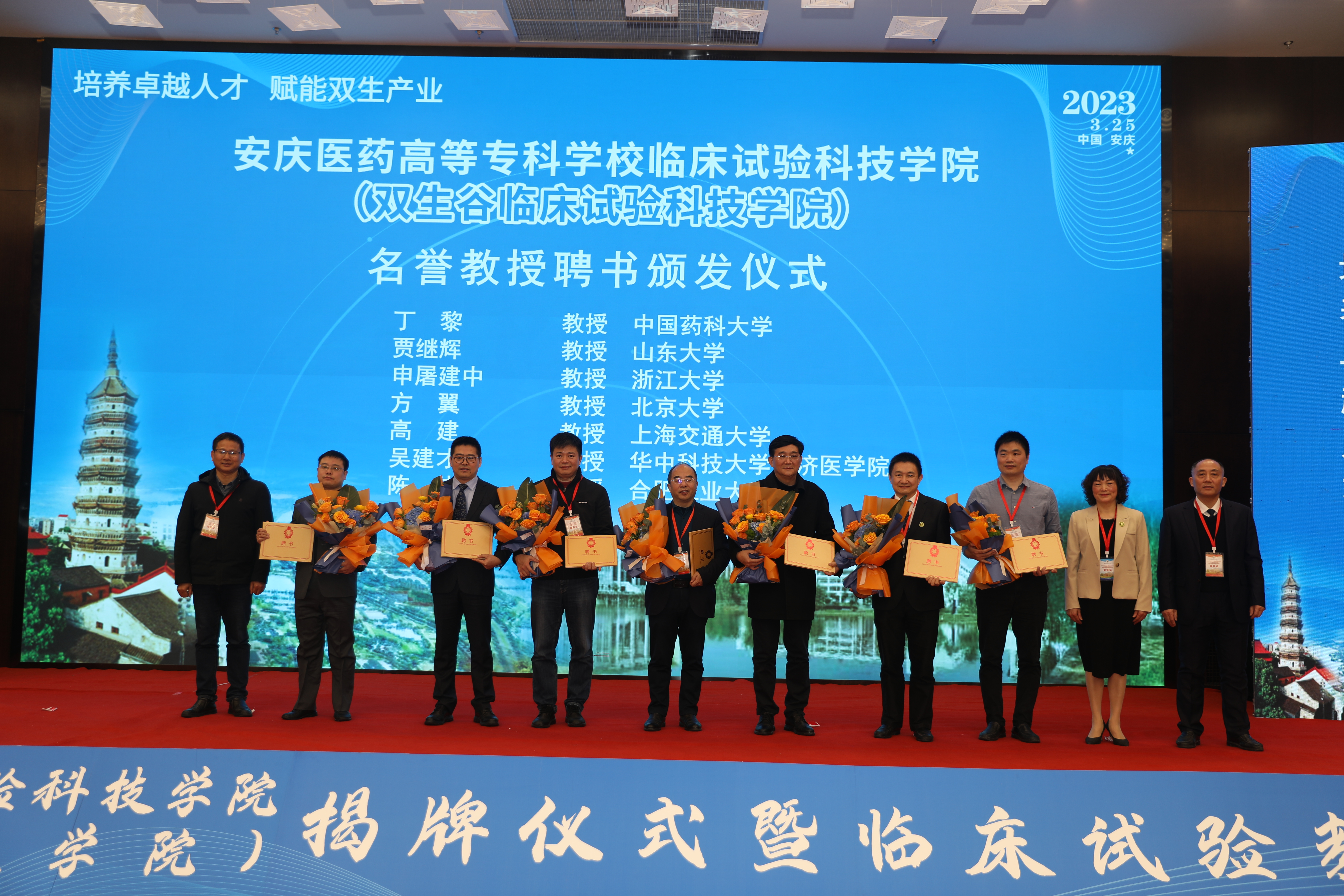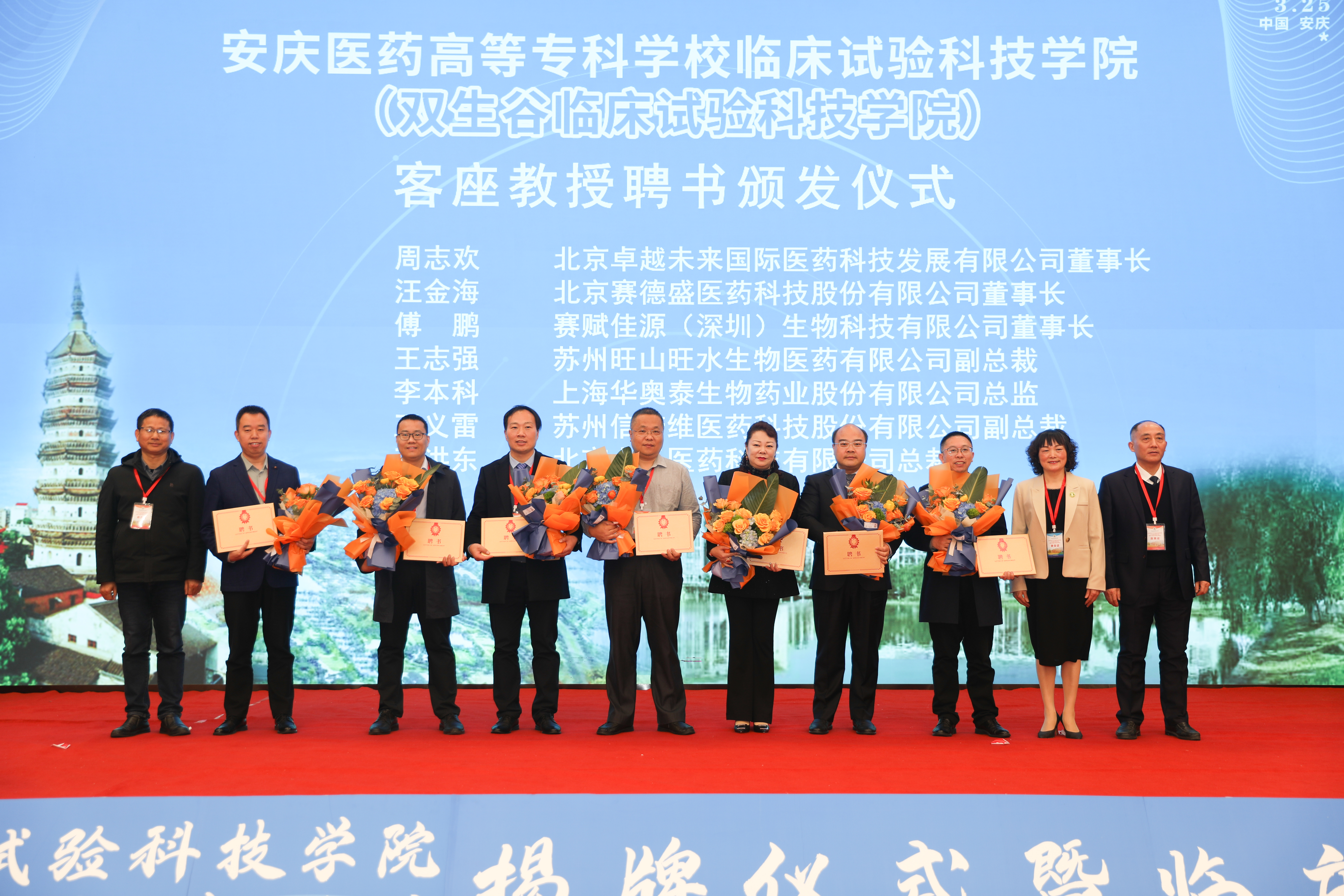 2023年3月25日上午,安慶醫藥高等專科學校臨床試驗科技學院(雙生谷臨床試驗科技學院)在安慶市隆重揭牌。安徽省政協副主席,安慶市委書記張祥安與安徽省委教育工委副書記、廳機關黨委書記王佩剛、安徽省衛健委一級巡視員董明培以及蚌埠醫學院院長、中國科學技術大學臨床醫學院執行院長翁建平共同為安慶醫藥高等專科學校臨床試驗科技學院揭牌。中國科學院院士王福生通過視頻對臨床試驗科技學院的揭牌表示了祝賀。安慶市委副書記、市長張君毅在揭牌儀式上致辭。中國醫藥新聞信息協會副會長兼秘書長葉建華,俄羅斯工程院外籍院士、昆翎醫藥聯合創始人兼首席戰略官張丹、中國藥科大學博士生導師丁黎等行業專家參加揭牌儀式。市委副書記胡紅兵、市委常委、組織部部長、市委常委、統戰部部長、秘書長徐雄、安慶市人大常委會副主任朱菊云、市政府副市長王趙春、市政協副主席尹志軍、市政府秘書長劉文俊出席揭牌儀式。