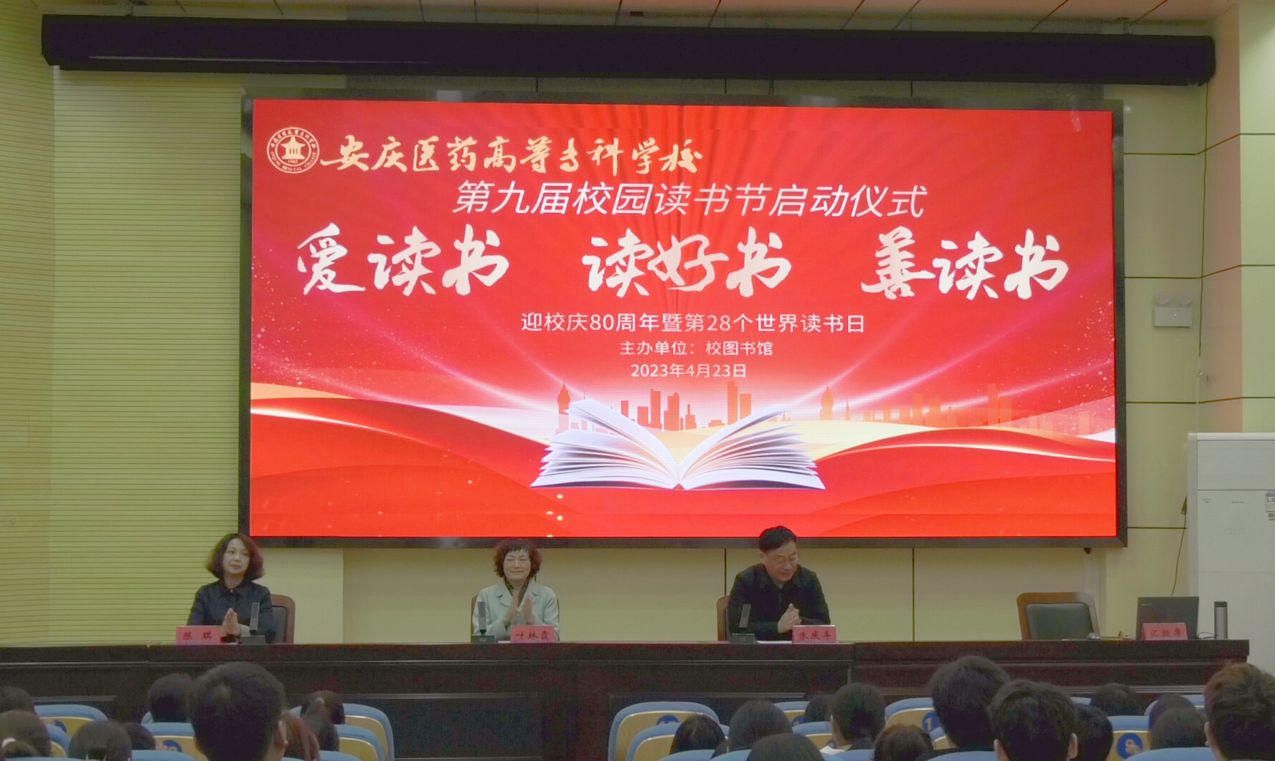 垂柳拂綠水,搖艷東風(fēng)年。為貫徹落實(shí)黨的二十大報(bào)告中“深化全民閱讀活動(dòng)”的要求,充分發(fā)揮校圖書(shū)館在書(shū)香校園建設(shè)中的作用,在喜迎第28個(gè)“世界讀書(shū)日”及校慶八十周年之際,4月23日中午,校圖書(shū)館在學(xué)術(shù)報(bào)告廳隆重舉辦第九屆校園讀書(shū)節(jié)啟動(dòng)儀式,黨委書(shū)記葉林霞,黨委委員、副校長(zhǎng)朱慶豐,黨委委員陳琪,相關(guān)職能部門及各學(xué)院的師生代表、獲獎(jiǎng)師生、讀者協(xié)會(huì)會(huì)員共170余人參加了活動(dòng),啟動(dòng)儀式由圖書(shū)館負(fù)責(zé)人高旭主持。