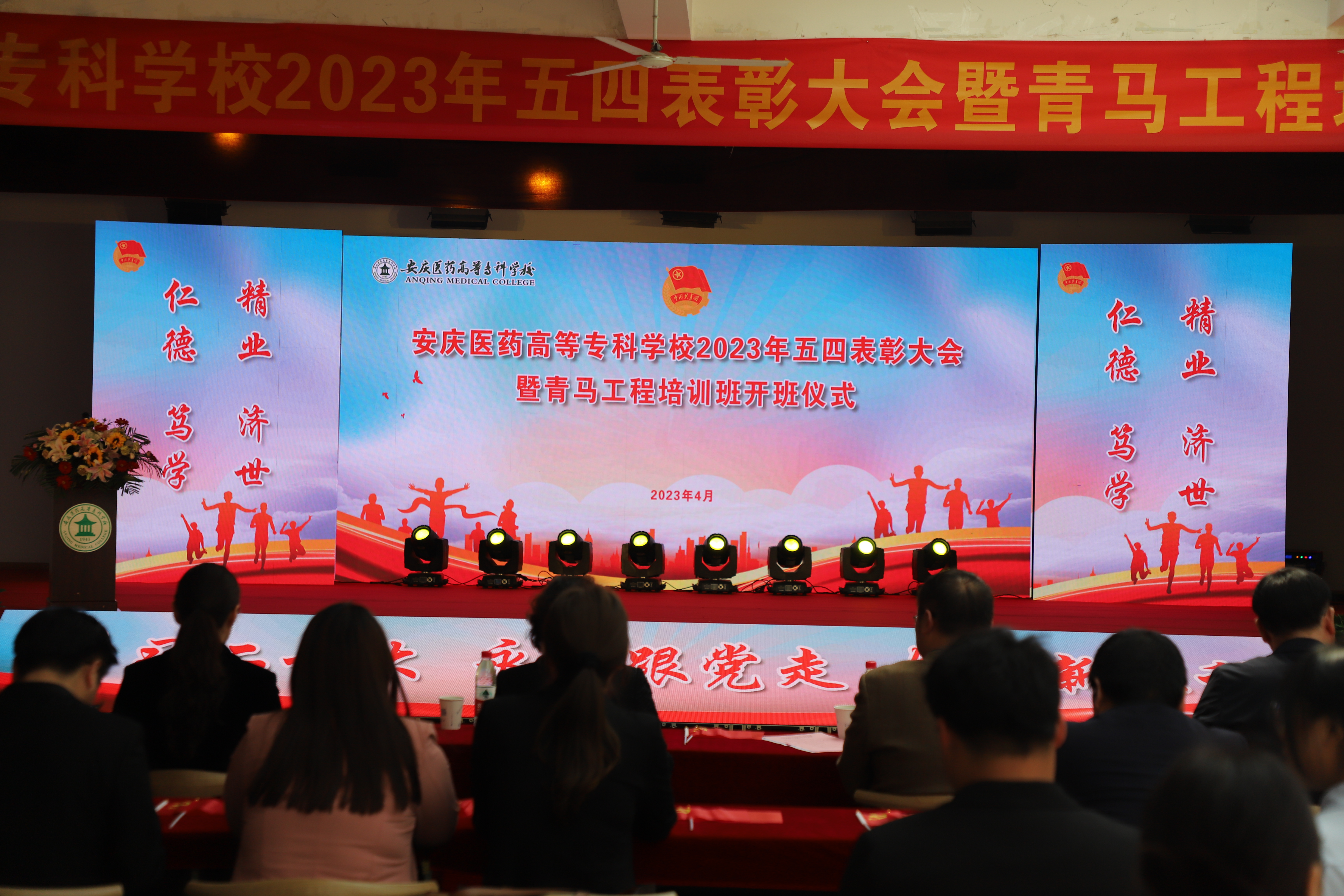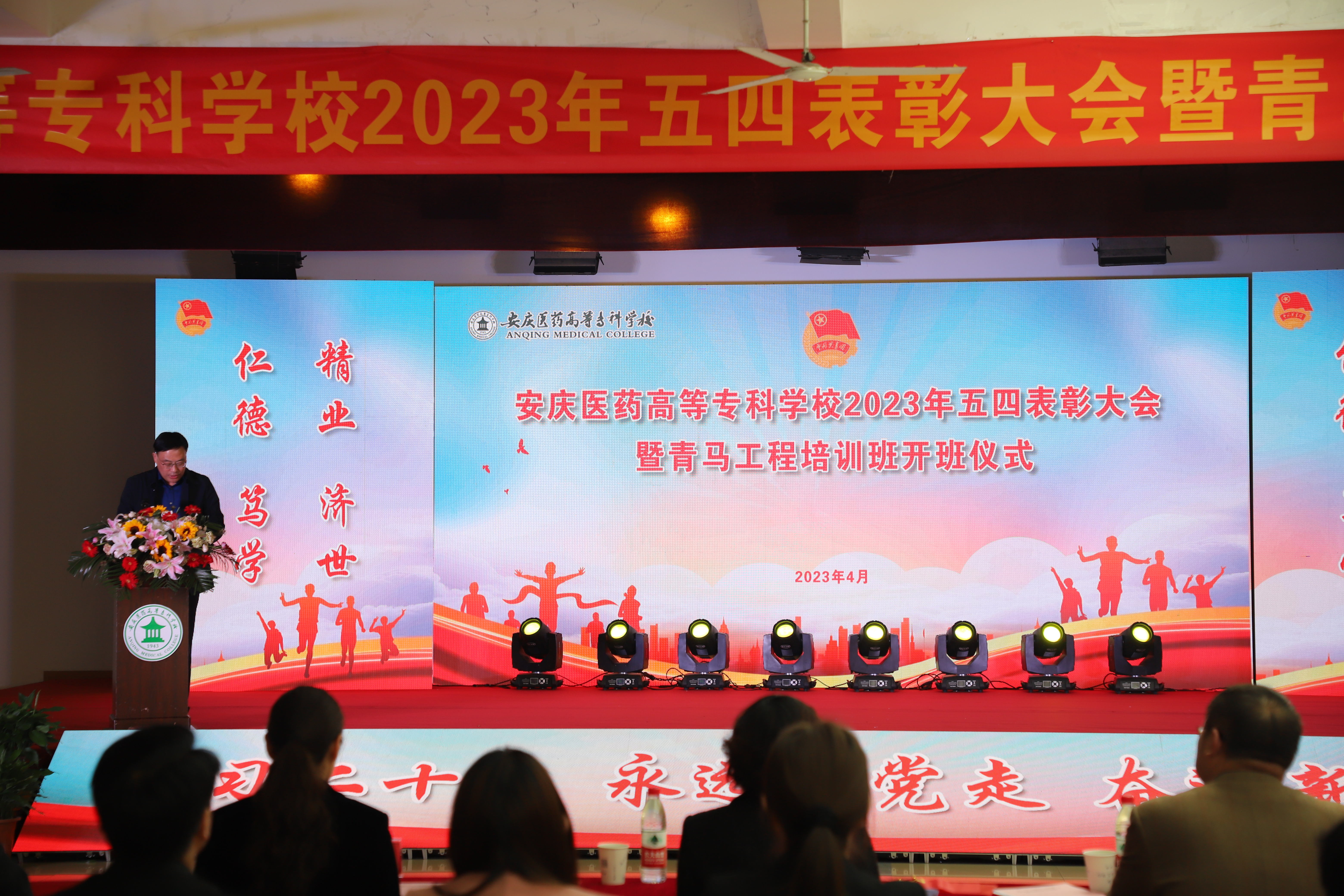 4月26日下午,我校在大學生活動中心舉行“學習二十大、永遠跟黨走、奮進新征程”2023年五四表彰大會暨青馬工程培訓班開班儀式。團市委書記項薇,團省委聯絡部部長、宜秀區委常委、副區長王春,團宜秀區委副書記喬晶晶,校黨委書記葉林霞、副書記張仕慶,校黨委委員、副校長朱慶豐,副校長毛以成,校黨委委員朱三九、陳琪出席大會。各部門負責人、教師團干代表以及學生代表參加。大會由陳琪主持。