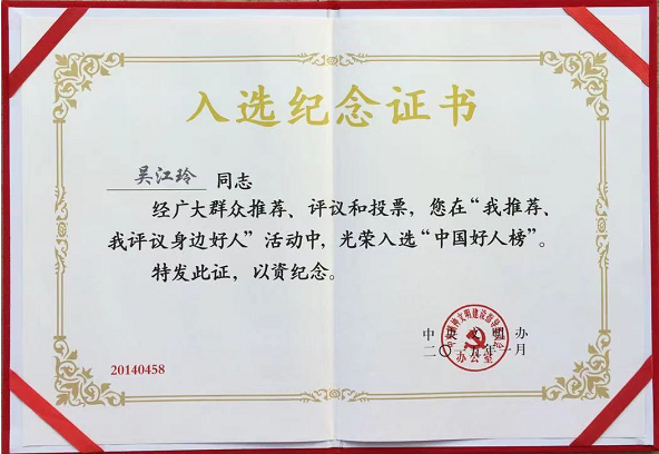 吳江玲對工作一絲不茍,主持安徽省教育廳課題五項,發表論文七篇,參編教材三本;2016年“關愛生命,沐浴陽光”志愿服務隊榮獲安徽省學雷鋒志愿服務“十佳志愿服務組織”稱號;多次指導學生參加全國康復治療技術專業學生技能競賽獲得團體第一,第三;2013年獲得省級教學成果二等獎。多年的努力也得到了社會的肯定,吳江玲2014年12月被共青團中央評為第十屆中國青年志愿者優秀個人獎,2015年1月被中央文明辦評“中國好人”稱號,2016年6月被中共安慶市委評為“優秀共產黨員”,2017年4月被中共安徽省委和安徽省人民政府評為“安徽省先進工作者”等。