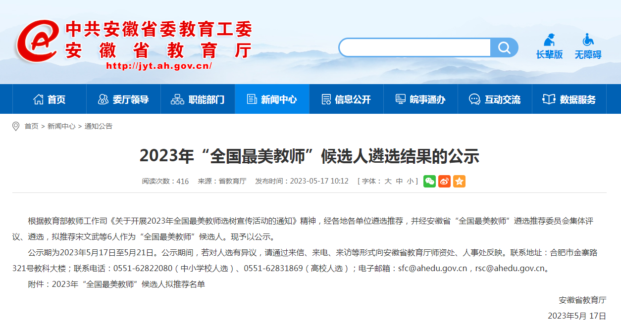 5月17日,安徽省教育廳網站公示2023年“全國最美教師”候選人遴選結果,我校教師吳江玲入選。