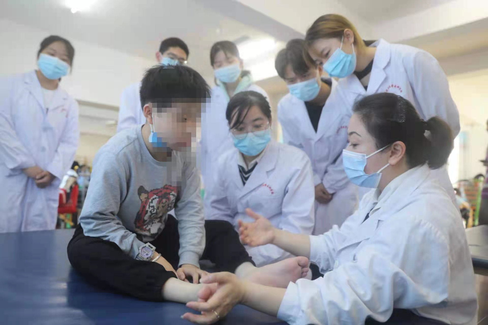 從2010年起,兩位小患者每個周末都會來到安慶醫藥高等專科學校康復治療技術實訓中心。吳江玲帶領學生志愿者運用專業知識和專業設備對兩位小患者進行細致的康復治療。經過大家的共同努力,兩位小患者的運動功能和日常生活活動能力都得到了很大的提高,飛飛實現短時間獨立步行,淘淘的左手能夠拿一些比較輕的物品。