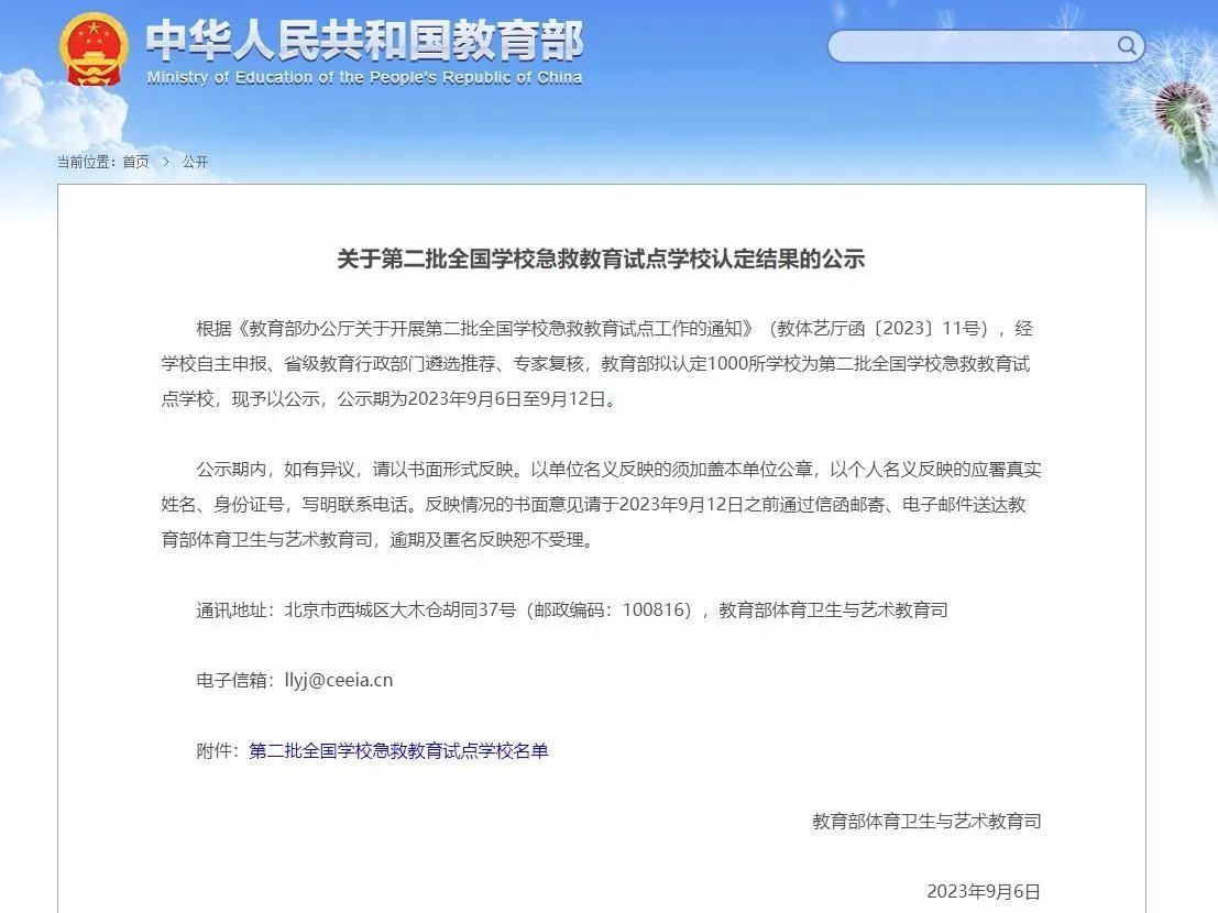 9月6日,教育部辦公廳發布公示,擬認定1000所學校為第二批全國學校急救教育試點學校,我校成功入選。