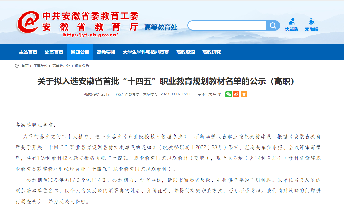 近年來,學校積極布局“十四五”時期職業教育規劃教材建設工作。按照教育部、省教育廳有關文件精神,通過立項建設的方式遴選了一批具有良好建設基礎的優秀出版教材,積極參加安徽省教育廳組織的首“十四五”職業教育規劃教材遴選,為我校高質量開展“十四五”規劃教材建設工作奠定了堅實基礎。