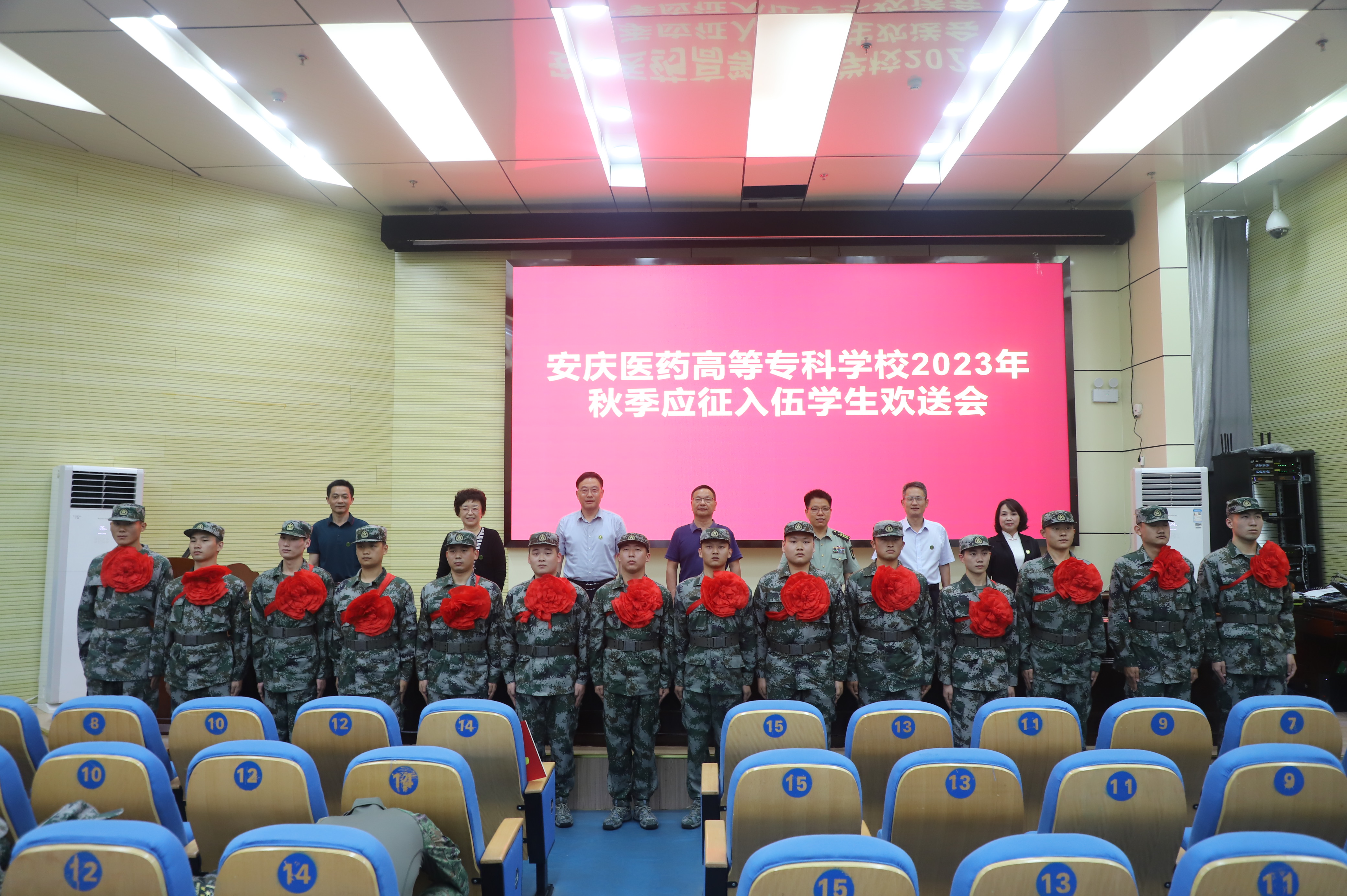 9月13日中午,我校2023年秋季大學生入伍歡送會在學校圖書館學術報告廳舉行,校領導張仕慶、陳燚、朱慶豐、朱雯、陳琪、劉毅等出席歡送會,宜秀區人民武裝部部長劉巨華受邀出席,為今年秋季從學校屬地應征入伍的14名大學生逐一佩戴紅花,送上慰問金并囑托他們牢記使命,在部隊建功立業,展現安慶醫專學子風采。歡送會由校黨委委員陳琪主持,相關部門、學院負責人、輔導員、退役復學士兵代表、學生代表參加會議。