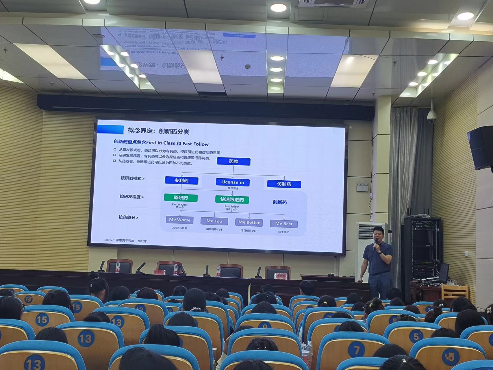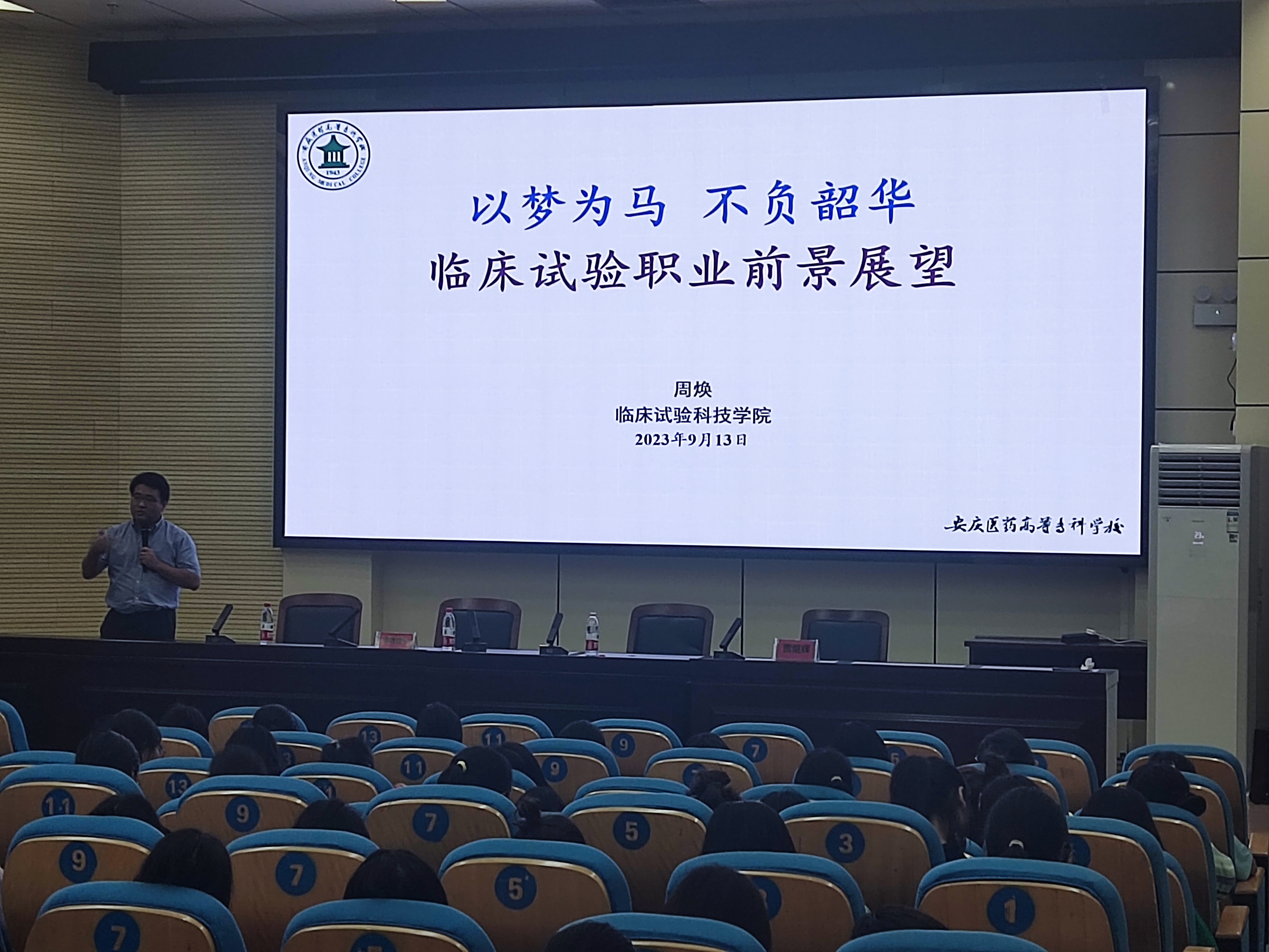 隨后,臨床試驗科技學院院長周煥教授為大家帶來講座“臨床試驗職業發展”。周院長與學生親切互動,引導學生思考人生規劃與發展路徑,并且結合個人經歷,以其所帶領的蚌醫一附院臨床試驗研究中心各項工作為例介紹臨床試驗的發展狀況、新時代的發展機遇以及臨床試驗領域的各就業方向。周院長寄期望于在新時代傳統臨床試驗技術轉型以及發展機制模式創新的大背景下,創新臨床試驗人才培養體系,不斷提高臨床研究質量及成果轉化能力。