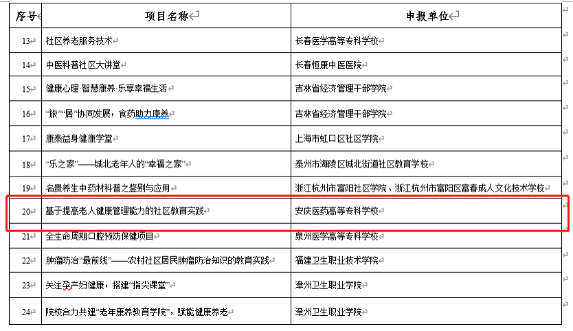 根據《關于開展社區教育“能者為師”特色課程推介共享行動的通知》(教職成司函〔2021〕43號)與《關于做好2022年下半年職業教育與繼續教育相關工作的通知》(教職成司函〔2022〕8號)要求,經各省級教育行政部門推薦、專家工作組審核與教育部指定網站公示等環節,教育部職業教育與成人教育司近日公布了社區教育“能者為師”實踐創新項目第三批啟動名單與社區教育“能者為師”系列特色課程推介名單。我校申報的“基于提高老人健康管理能力的社區教育實踐”入選教育部社區教育“能者為師”實踐創新項目。