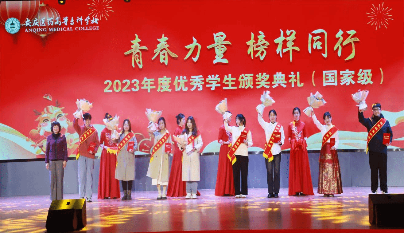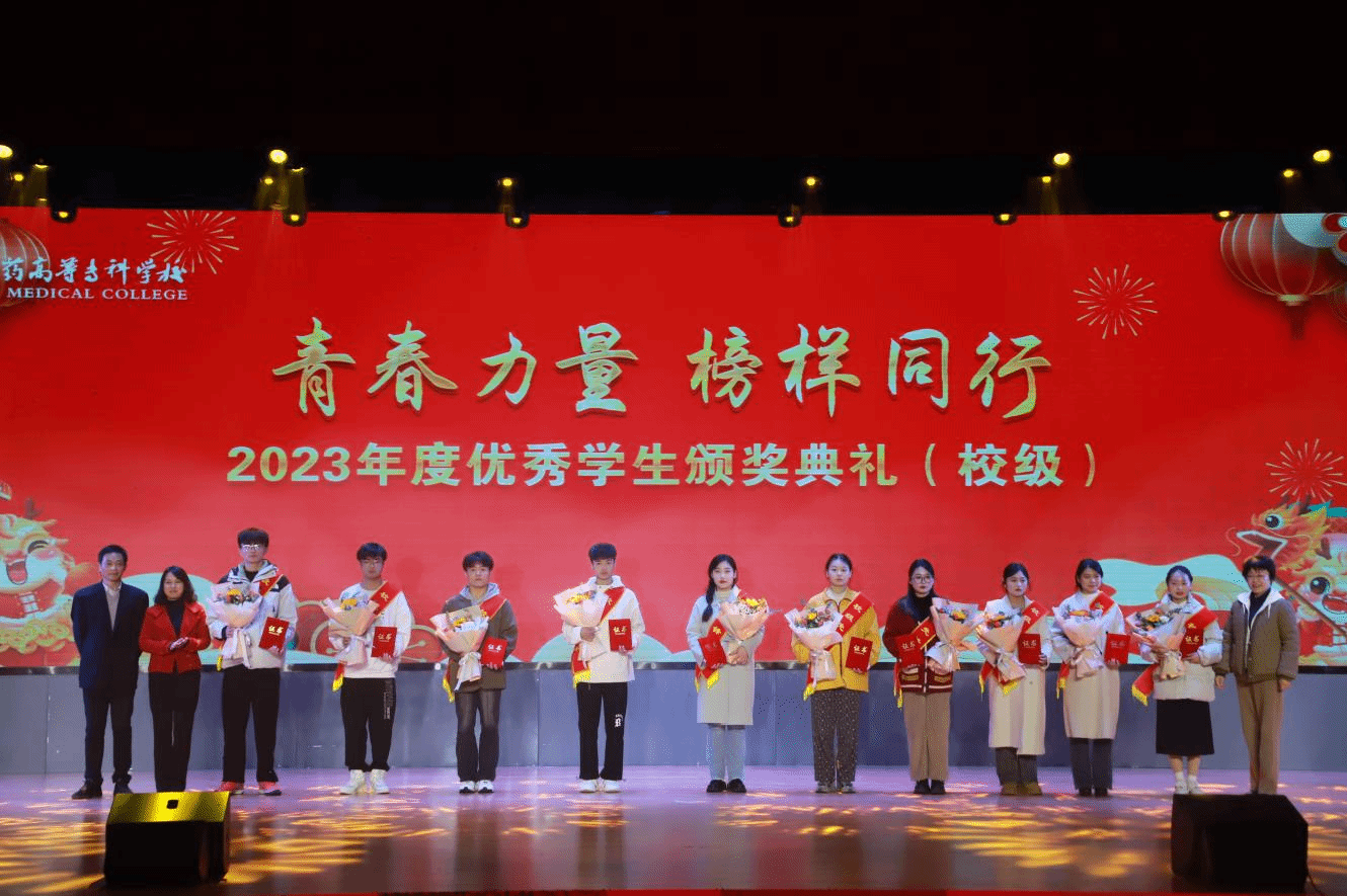 2023年,全校師生團結奮進,成果豐碩,學生榮獲市級以上等各級榮譽、表彰120余項。晚會期間還舉辦了“青春力量,榜樣同行”優秀學生頒獎典禮。黨委書記葉林霞為獲得全國職業院校技能大賽化學實驗技術賽項一等獎、第十八屆“振興杯”全國青年職業技能大賽銅獎等國家級榮譽的學生代表頒獎,并送上鮮花。校黨委副書記張仕慶,校黨委委員、紀委書記陳燚為獲得第九屆安徽省“互聯網+”大學生創新創業大賽金獎、第十屆“挑戰杯·華安證券”安徽省大學生課外學術科技作品競賽一等獎等省市級榮譽的學生代表頒獎。校黨委委員、宣傳部部長朱雯,校黨委委員、黨政辦主任陳琪,校黨委委員、藥學院黨總支書記、院長劉毅為獲得2023年度校園之星等各類校級榮譽的學生代表頒獎。