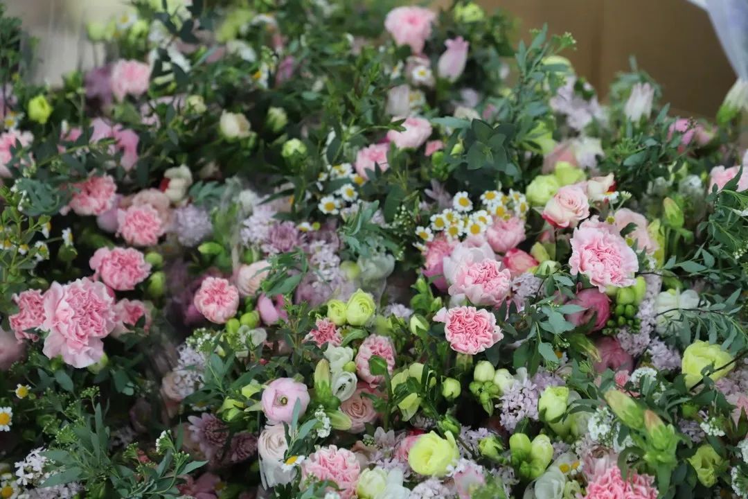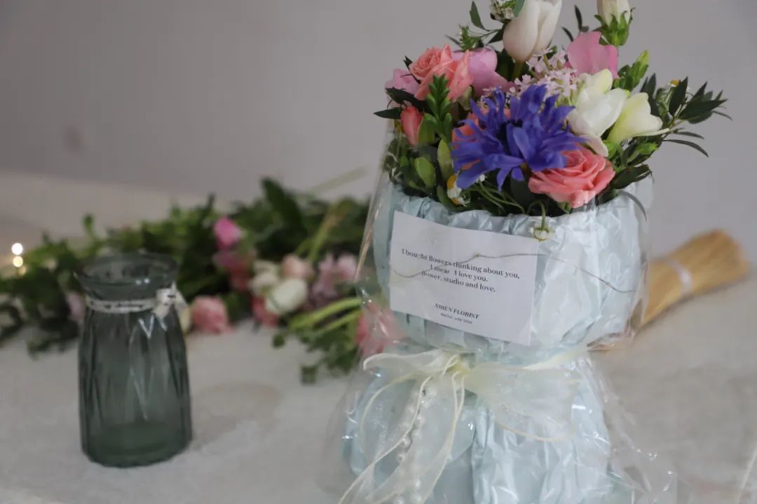 老師們在培訓師的悉心指導下,大膽發揮自己的想象力,通過自己靈巧的雙手,將玫瑰、康乃馨、洋牡丹、風鈴、銀蓮、郁金香、洋甘菊等多種花材,根據不同的色彩、形狀搭配得錯落有致,活動現場仿佛是一個花的海洋,創造了一件件獨一無二的作品,每一件作品都美好燦爛,花香繚繞的花藝作品包含了女職工們對幸福美好生活的祝愿。