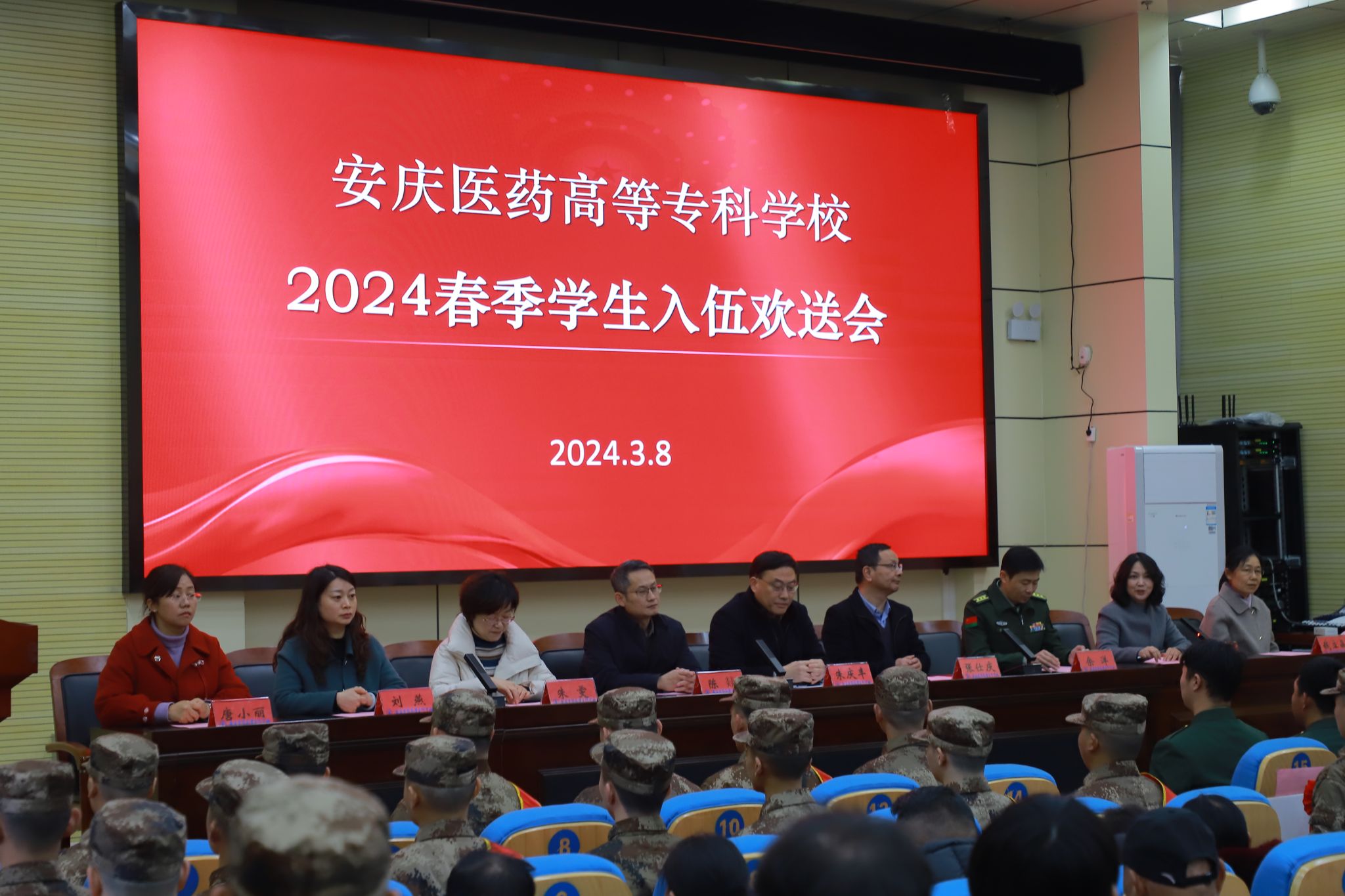 3月8日,我校在圖書館學術報告廳隆重舉行2024年春季大學生應征入伍歡送會。宜秀區人民武裝部部長余洋,校領導朱慶豐、張仕慶、陳燚、朱雯、陳琪,各二級學院和相關部門負責人、輔導員,春季從學校應征入伍的22名新兵代表及50余名家長,退役士兵代表、國旗護衛隊及國防志愿服務團的同學們以及學生代表參加歡送會。