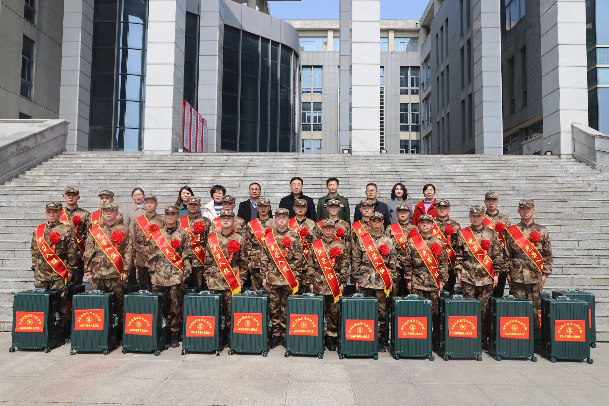 歡送會后,與會領導、老師、同學們與應征入伍新兵合影留念。入伍新兵和老師們、家長們熱情相擁,依依不舍道離別。新兵們胸前佩戴著紅花,帶著報效祖國的滿腔熱忱踏上軍旅之路。衷心祝愿我校所有即將入伍的戰士們,前程似錦,戰功頻傳!