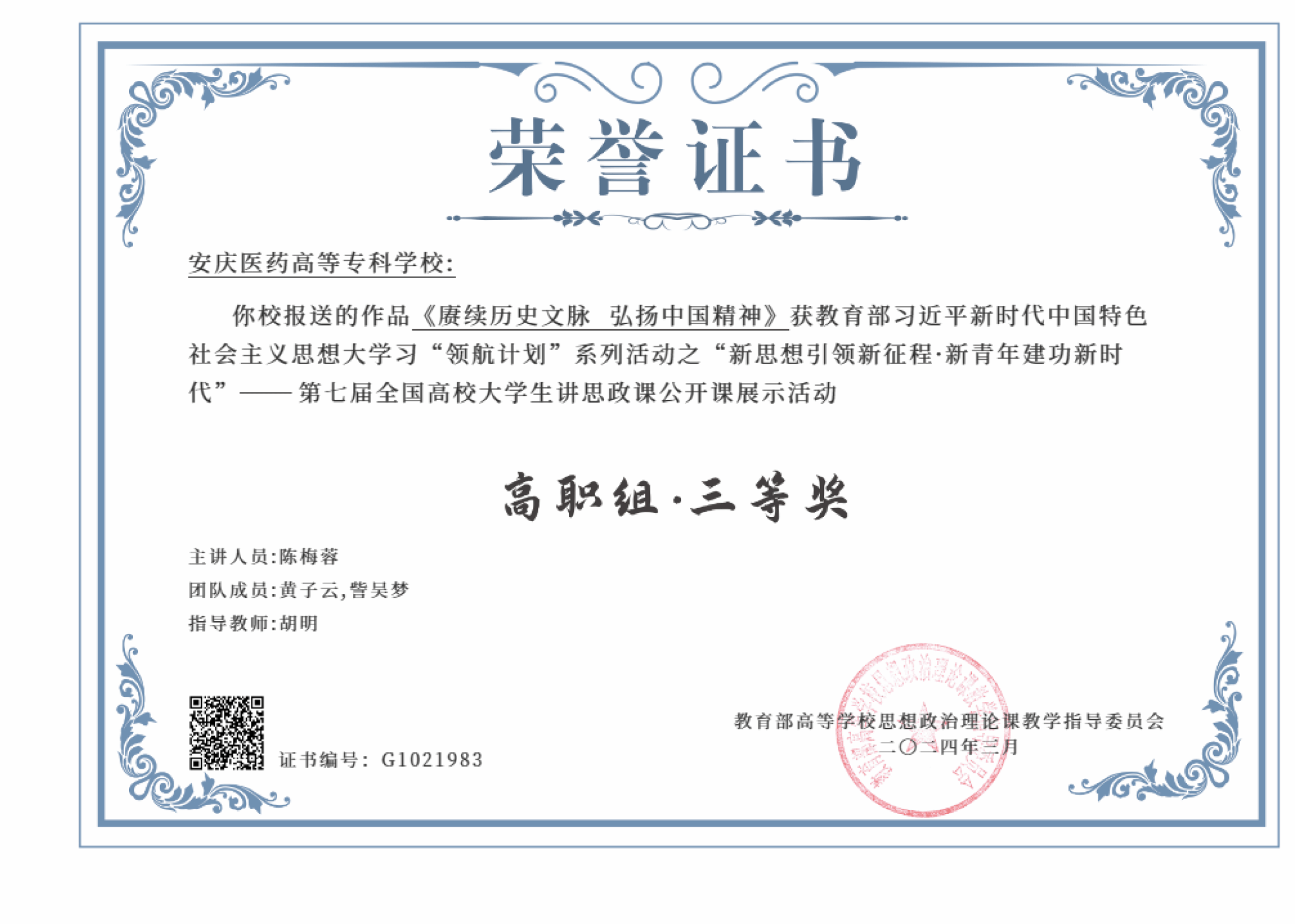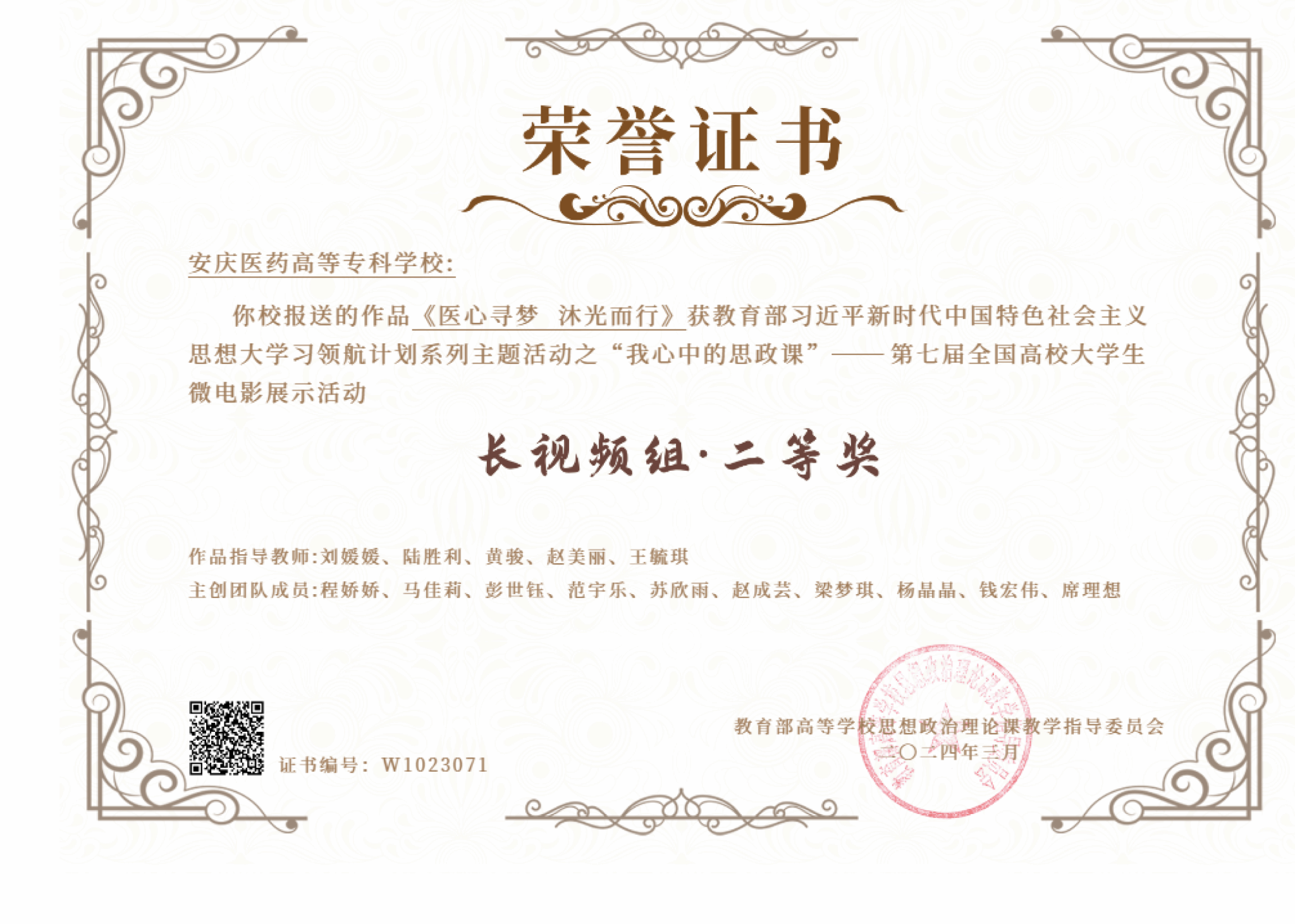 2024年3月18日,由教育部高校思政課教學指導委員會主辦的“我心中的思政課”第七屆全國高校大學生微電影展示活動、“新思想引領新征程·新青年建功新時代”第七屆全國高校大學生講思政課公開課展示活動獲獎名單正式公布。我校報送的作品《醫心尋夢 沐光而行》獲大學生微電影長視頻組全國二等獎;作品《賡續歷史文脈 弘揚中國精神》獲大學生講思政課高職組三等獎。這是我校思政課教師指導學生在教育部組織的全國大賽中取得的新突破,充分展現了我校師生扎實的馬克思主義理論素養、昂揚奮進的精神風貌和思想政治理論課守正創新的鮮明特點。