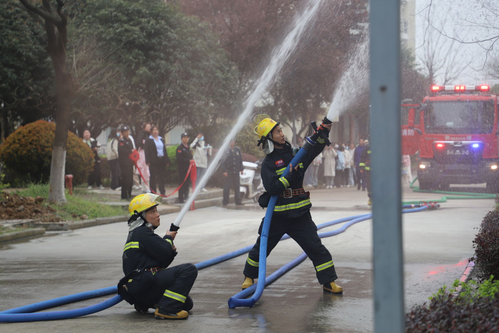 為確保此次消防應急疏散演練活動能安全有序進行,學校高度重視,在演練開始前,召開了專題協調會,制定了詳細的演練方案,對演練步驟、人員分工、疏散路線等做了周密安排。演練開始后,隨著朱慶豐校長下達演練開始的口令,各組人員迅速到崗,模擬學生宿舍突發火災的情景,參演學生在學生疏散管理組的引導下迅速、有序、安全地進行疏散,應急醫療保障組對模擬受傷學生進行了臨時醫療救治,安全保衛組在參演消防官兵的協助下順利撲滅著火點。整個演練過程緊張有序,達到了預期效果。