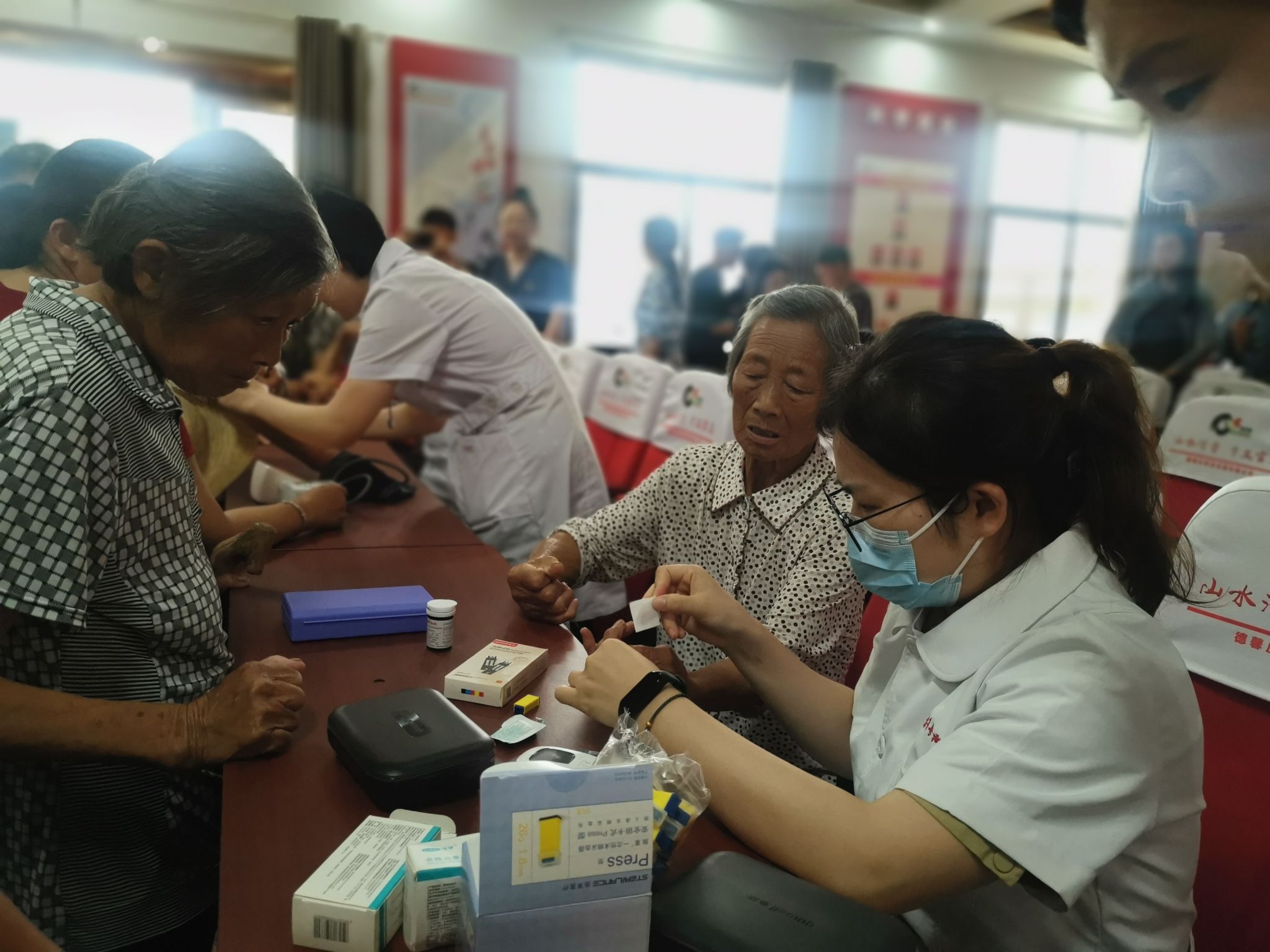 全體黨員首先來到潛山縣官莊鎮官莊村。活動現場,師生志愿者們充分發揮專業優勢,有序為當地居民量血壓、測血糖、贈送防暑物品,并給予日常健康生活方式指導;同時組織了夏季防病治病、科學飲食、預防溺水等知識宣講。官莊村民對此次健康服務表示很滿意,希望我校師生能夠經常下鄉入村為基層做實事。