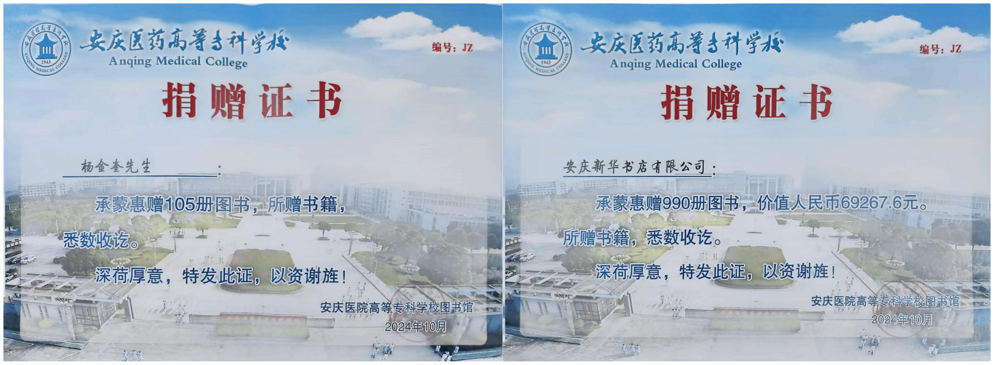 近日,我校圖書館榮幸收到兩批圖書捐贈:我校82屆校友、原黨委書記楊金奎先生再次慷慨解囊,向圖書館捐贈了105冊私人藏書;安慶市新華書店有限公司向校圖書館贈送了涵蓋文學、醫(yī)藥衛(wèi)生、生物科學、哲學宗教等多個領(lǐng)域的圖書,共計444種,990冊,總價值高達69267.60元。