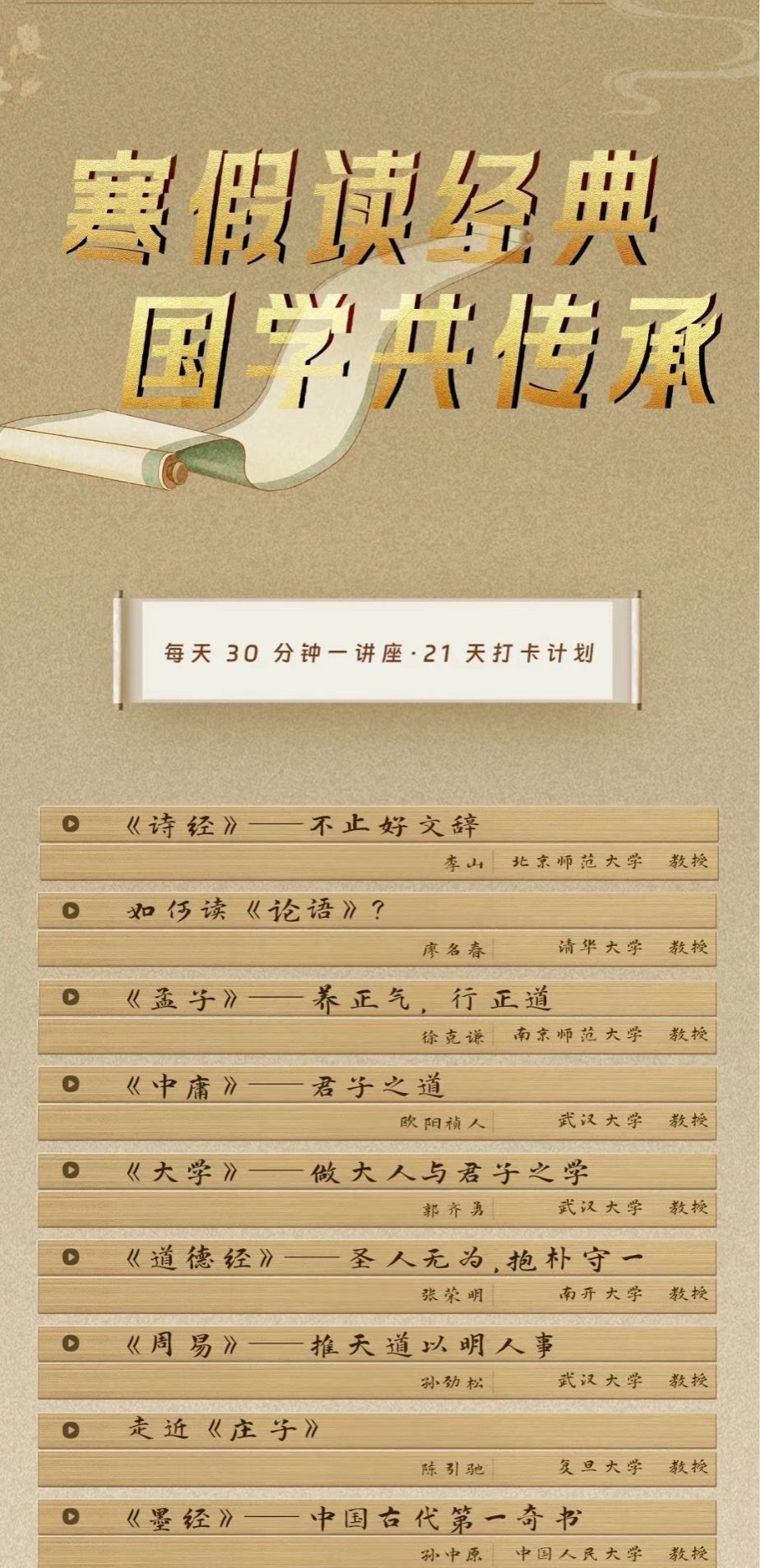 本次活動以“每天30分鐘一講座,21天持續打卡”的創新形式展開,旨在引導并鼓勵學生們充分利用寒假時光,通過觀看國學經典講座視頻,深入領略和傳承中華優秀傳統文化的精髓,進而提升自身的文化素養。為此,校圖書館精心挑選了《論語》、《孟子》、《大學》、《中庸》等國學經典著作的專家解讀視頻,每日推送給參與活動的學生,并設置了相應的打卡任務,激勵學生們持之以恒地學習,同時分享自己的感悟和收獲。