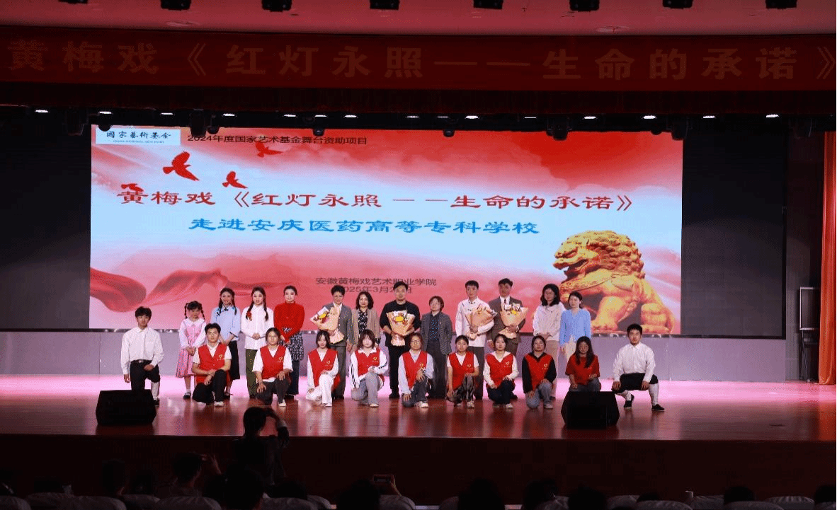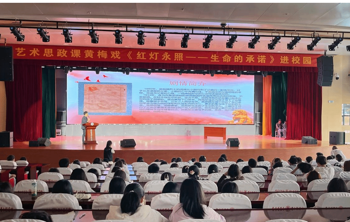 2025年3月26日下午,學校雙創中心百花亭學術報告廳內,500余名師生共上一堂特殊的藝術思政課。由安徽黃梅戲藝術職業學院師生帶來的國家藝術基金舞臺藝術資助項目——黃梅戲《紅燈永照——生命的承諾》來校演出,校黨委委員、黨政辦主任陳琪,校、院兩級團組織負責人與學生代表共同觀看。婉轉悠揚的黃梅戲唱腔,結合跌宕起伏的紅色故事,讓師生們近距離感受到傳統戲曲獨特的藝術魅力,以及紅色文化穿越時空的蓬勃生命。