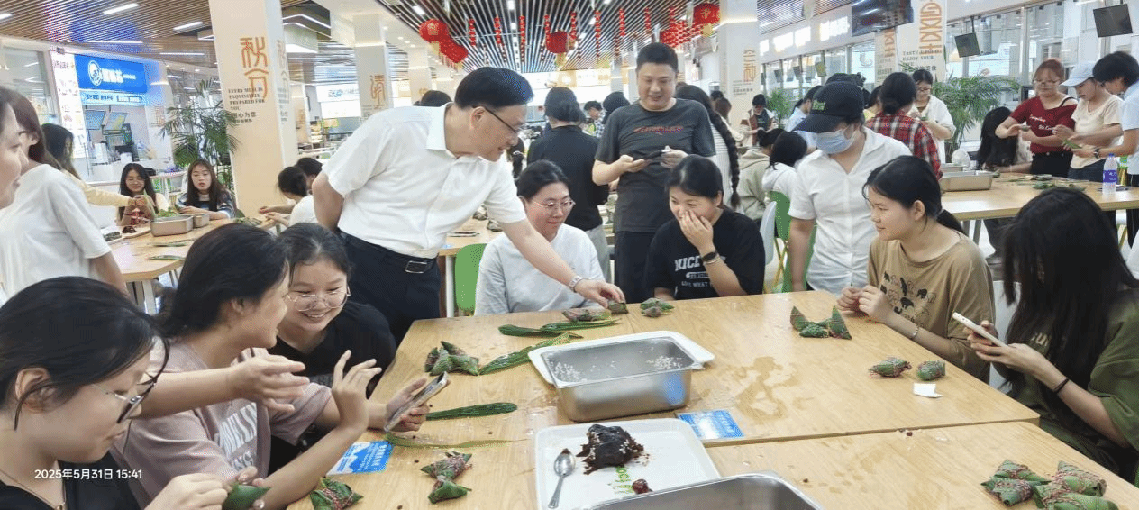 活動伊始,來自我校全國各地的學生制作了不同風味的粽子, 如南方蜜棗甜粽、北方蛋黃咸粽等,這既是對一場美食文化之旅,也是一次對傳統文化內涵的學習?;顒蝇F場校長朱慶豐與學生熱情地互動交流,親手指導同學們折粽葉、填糯米、捆扎等技巧,共同體驗傳統美食制作的樂趣?,F場氣氛熱烈而溫馨,同學們互相交流著各自家鄉的端午習俗和包粽子的心得,歡聲笑語此起彼伏。