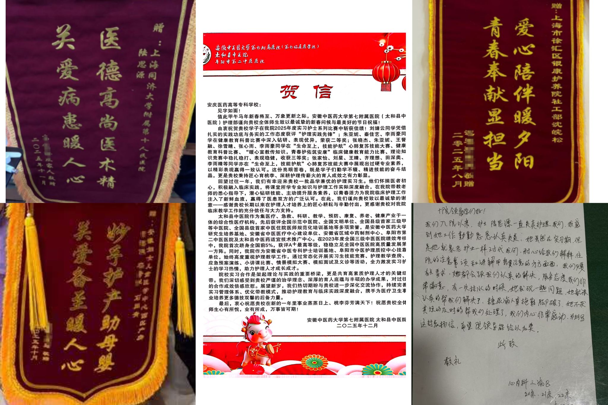 成績的背后,體現的不僅是學生個人付出,更源于學院 “雙基地”育人機制的持續優化。實習中實現學校學習與實際應用的無縫對接,讓學生們提早感知職業角色與行業需求。賀信、旌旗、表揚信等不僅評價了學生的實習表現,更是對護理學院教育模式的“無聲認證”:強化崗位真實情境下的能力建設,培育懂專業、懂關愛的復合型人才體系,正在產生可觀測的社會認同。