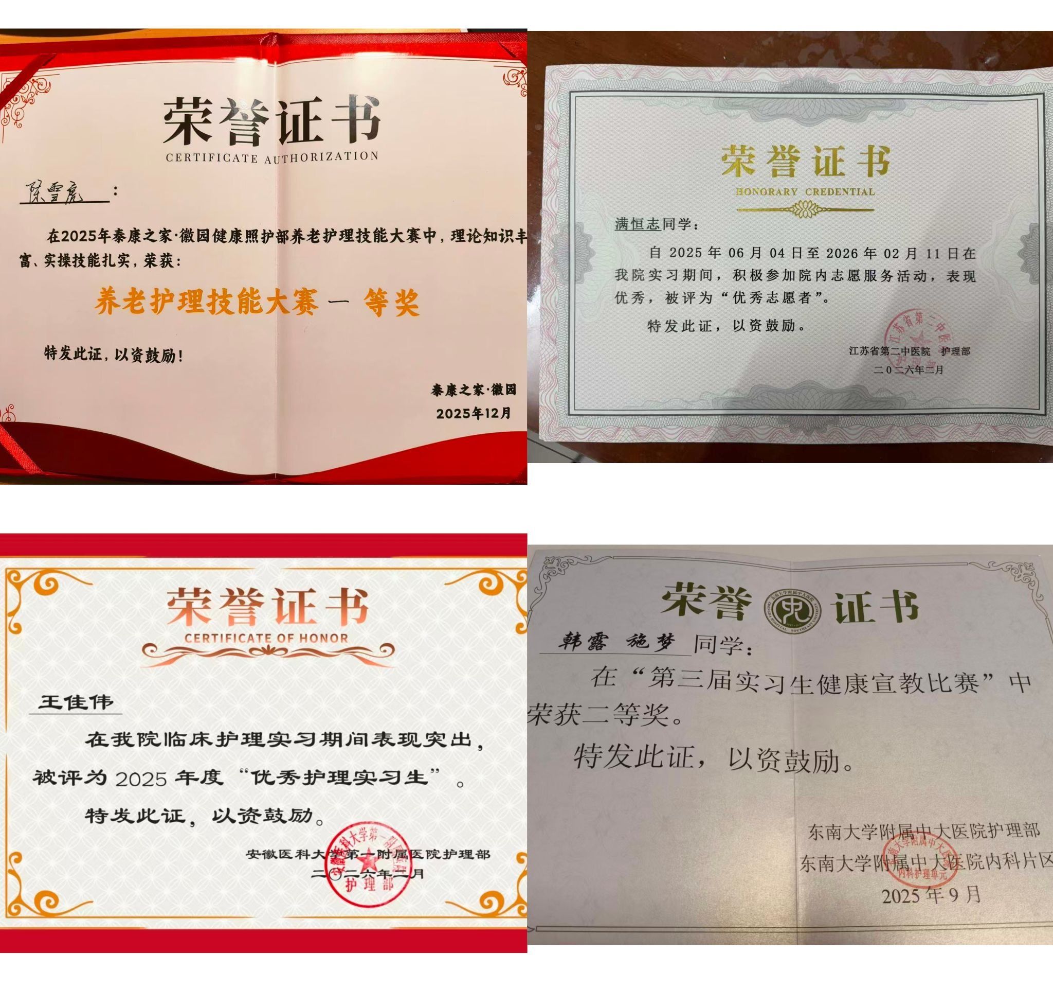 從東南大學附屬中大醫院到泰康之家·徽園康養中心,實習單位在組織各類崗位練兵時頻繁發現我院學生的身影。不僅是常規照護、技能實操過關——許多同學也在院內志愿服務、醫患溝通、人文關懷等方面表現出令人驚喜的成熟度:在多家實習單位舉辦的職業技能競賽中,實習生面對高強度挑戰仍能沉著應戰,斬獲多項一、二、三等獎;志愿身影出現在患者引導、信息咨詢、病患安撫等多種場合,多人獲評“優秀志愿者”;多家單位綜合評優后,我院50余名學生獲評“優秀實習生”榮譽稱號。
