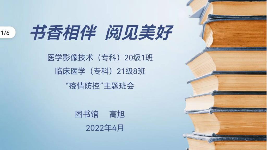 2022年4月10日晚上8點,圖書館負責人高旭為醫學影像技術20級1班和臨床醫學21級8班的同學們開展了一次題為“書香相伴,閱見美好”的疫情防控線上主題班會, 共125名師生參加。