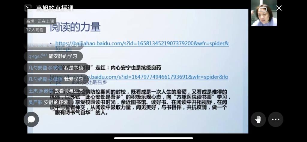 高旭首先指出在當前國內疫情呈多點散發與局部爆發態勢下,為確保校園平安穩定,加強疫情防控措施實行校園封閉管理的必要性和重要性,回顧了三月初以來學校的疫情防控工作,并列舉了若干在疫情防控情況下困擾學生的問題,建議同學們從閱讀中汲取力量進行有效的心理調適。隨后她和學生們分享了2020年武漢封城期間“方艙醫院讀書哥”的事例以及宋代詞人蘇軾的名句“此心安處是吾鄉”中所蘊含的人生哲理,勉勵同學們以“此心安處是吾鄉”的積極樂觀心態,向“方艙醫院讀書哥”學習,靜下心來,享受閱讀,在閱讀中開拓視野,豐富心靈,與書相伴,閱見美好,共抗疫情,做“腹有詩書氣自華”的人。最后,高旭向同學們詳細介紹了圖書館的圖書資源及訪問方式,并推薦了三個正在進行中的第八屆校園讀書節活動。