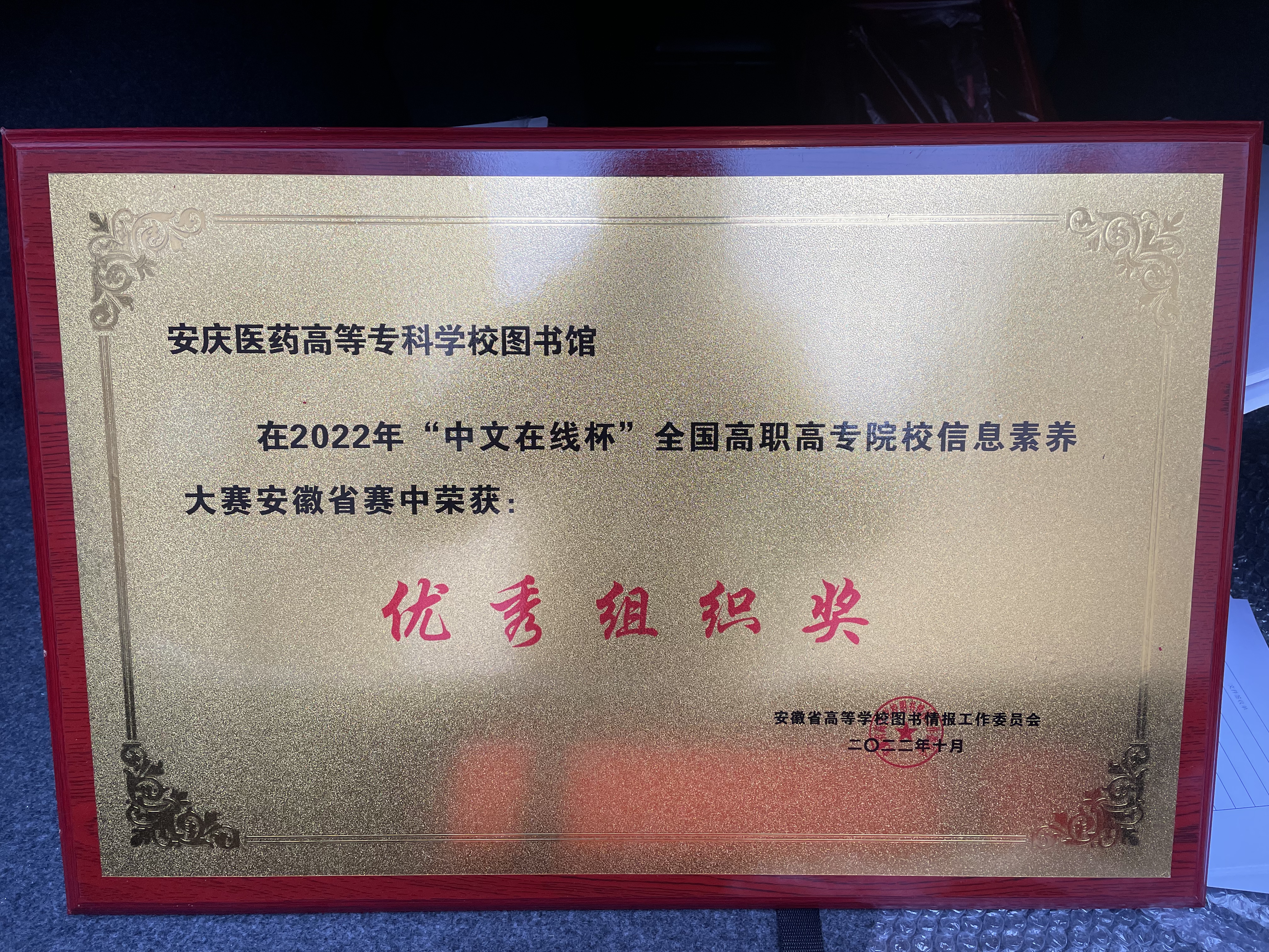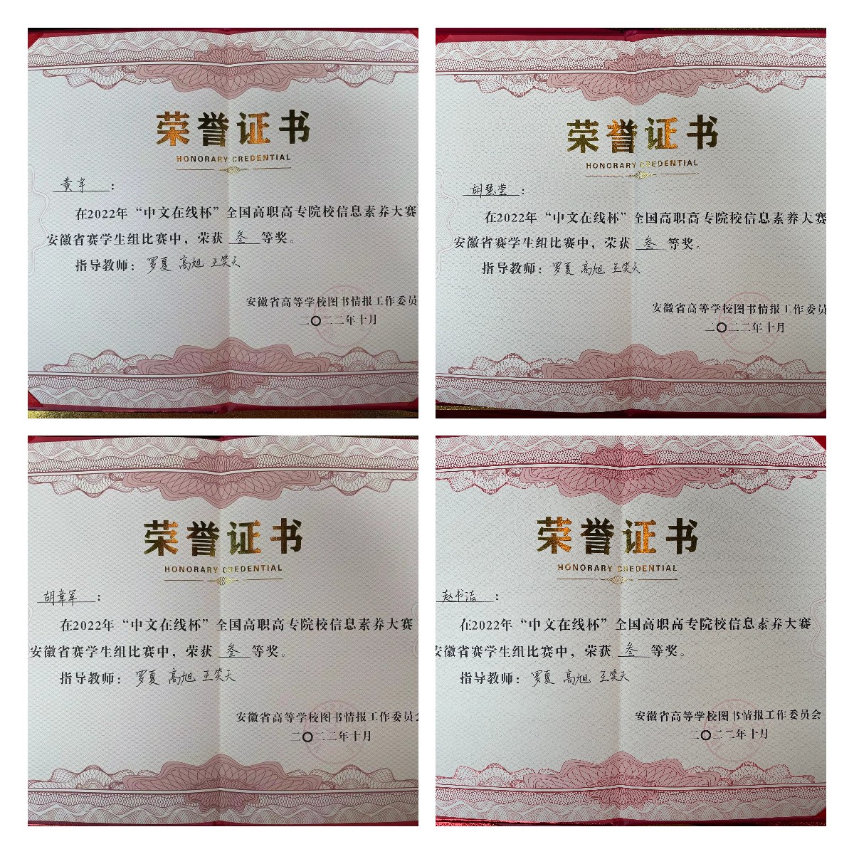 我校經校賽產生的十名選手參加了安徽省省賽,護理(專科)20級13班黃宇、助產(專科)21級1班胡慧瑩,藥學(專科)21級6班胡章軍、護理(專科)21級1班趙書潔喜獲安徽省省賽三等獎;其中黃宇和胡慧瑩晉級國賽,參加了國賽第一輪的角逐。全省共有8所高職高專圖書館獲“優秀組織獎”,我校圖書館取得突破,首次獲此獎項。