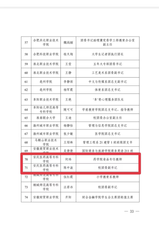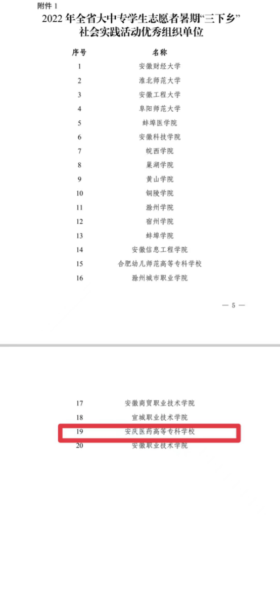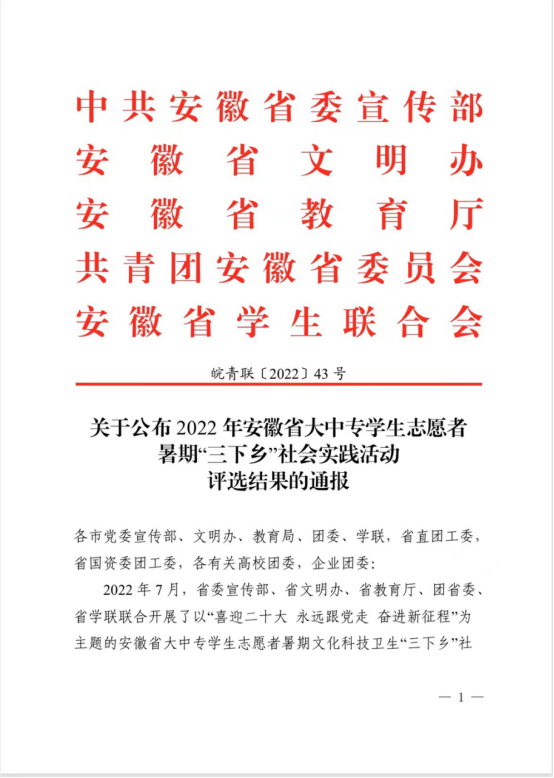 近日,省委宣傳部、省文明辦、省教育廳、團省委和省學聯聯合印發了《關于公布2022年安徽省大中專學生志愿者暑期“三下鄉”社會實踐活動評選結果的通報》,對表現突出的先進集體和個人進行表彰。我校被評為“優秀組織單位”,2人被評為“優秀個人”。