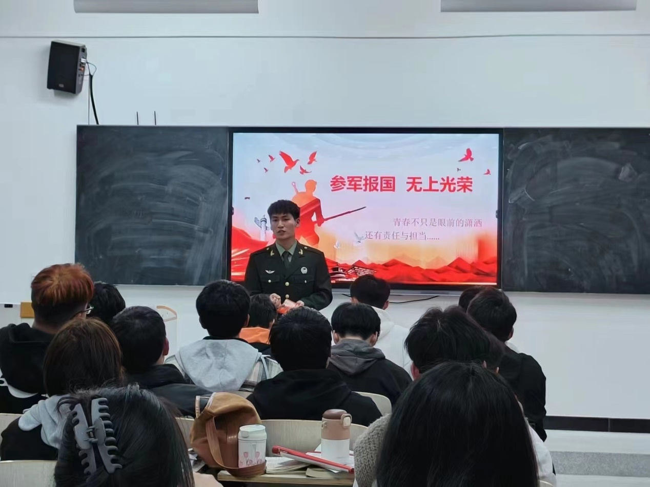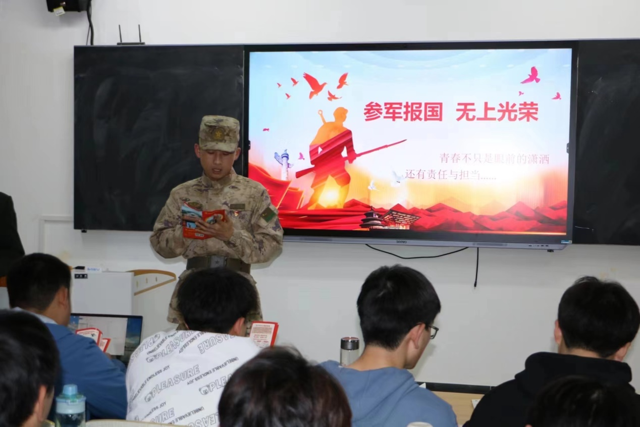 經(jīng)驗分享走實走心。10名退役士兵組成的校園征兵形象代言人通過用“身邊人教育身邊事”的朋輩教育激發(fā)奮進力量,深入到學生社區(qū)、班級開展系列宣傳活動,進一步提升征兵工作質效,用向上向善向美的奮斗故事指引同學們學習成長,有效激發(fā)了學生的參軍報國熱情,為部隊輸送更多軍事過硬、醫(yī)技專精的優(yōu)質兵員。校園征兵形象代言人2021級藥學2班王子平同學到各個學院、班級通過講述自己對參軍入伍的認識及踏入軍營第一夜的難忘體會,多方面介紹了豐富多彩的軍旅生活,展現(xiàn)了刻苦訓練的優(yōu)良作風,鼓勵同學們聽黨話、跟黨走,以青春之我、奮斗之我為強國夢、強軍夢砥礪前行、奉獻擔當?shù)那啻猴L采,希望同學們積極投身軍營,學到扎實的理論知識,練就過硬的軍事本領,嚴守嚴明的組織紀律和養(yǎng)成良好的生活習慣,向優(yōu)秀“四有”革命軍人靠攏。