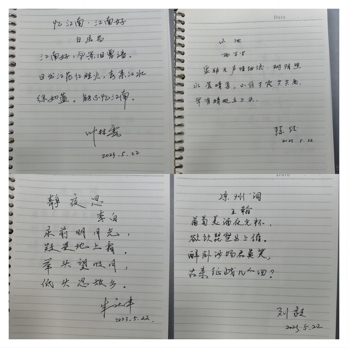 為傳承中華優(yōu)秀傳統(tǒng)文化,感受歷史的厚度與溫度,校圖書館通過書于紙、銘于心的手抄方式,舉辦了“傳承經(jīng)典、抄書接力”活動(dòng)。校領(lǐng)導(dǎo)親臨現(xiàn)場參與活動(dòng)并留下墨寶,截止6月20日,師生共接力抄寫詩詞80余篇。