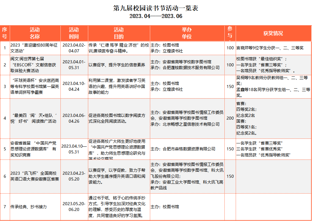 為深入貫徹黨的二十大關(guān)于深化全民閱讀活動(dòng)的重要部署,引導(dǎo)激勵(lì)全校師生愛讀書、讀好書、善讀書,大力營造濃厚的讀書氛圍,推動(dòng)“書香校園”建設(shè),自4月23日第九屆校園讀書節(jié)活動(dòng)啟動(dòng)至6月20日,校圖書館成功組織了7次閱讀推廣活動(dòng),并在3項(xiàng)圖書館業(yè)內(nèi)省級賽事中榮獲佳績。